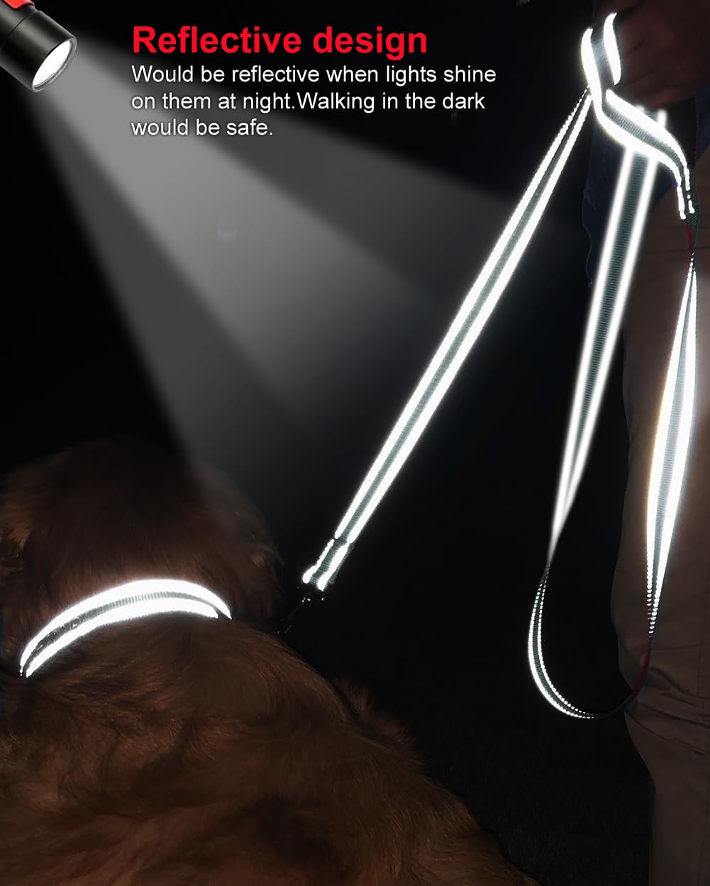 DOUBLE-SIDED REFLECTIVE: Upgraded double-sided reflective leash features reflective stitching on both sides to improve its visibility and would be reflective when lights shine on it at night. Can keep your doggie safe during evening walks or runs