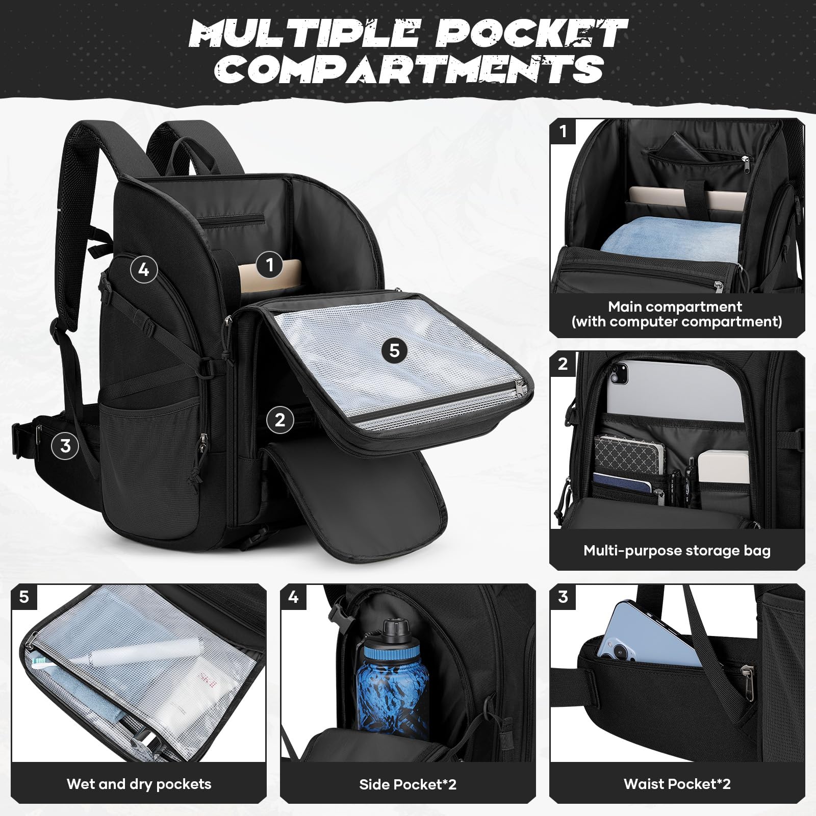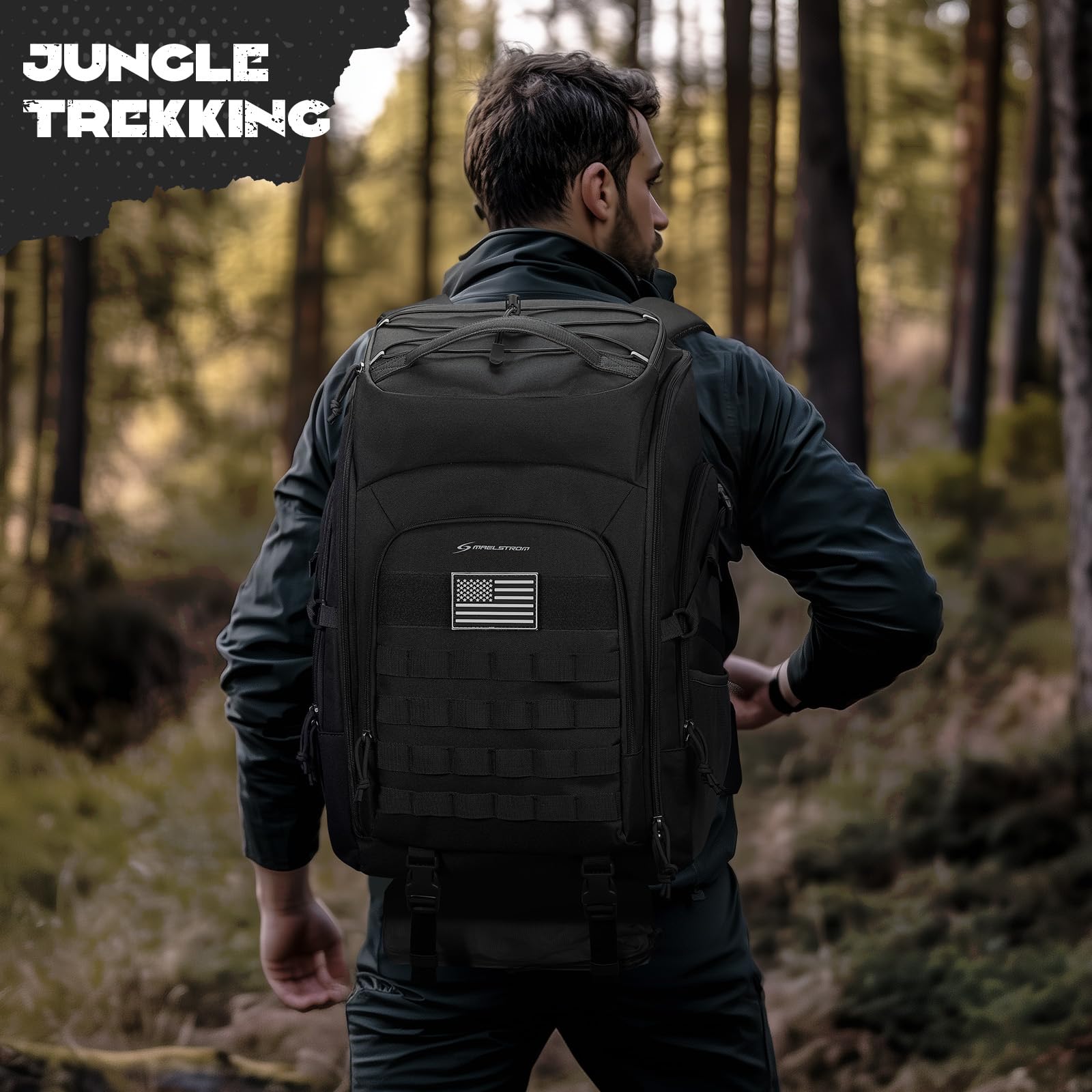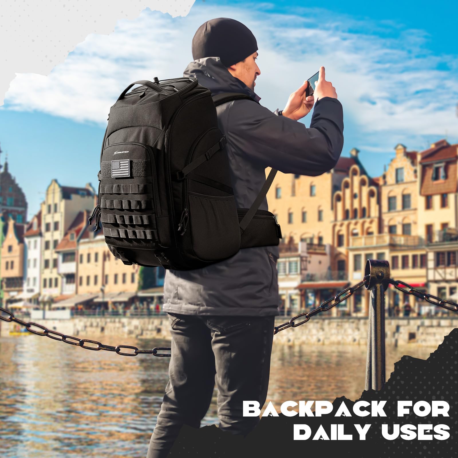 Modular Scalability: backpack for men features a double-layer fabric laser-cut MOLLE mounting system on the front that allows you to mount a variety of tactical pouches that can be combined with other gear. Top straps allow you to roll up a sweatshirt or thin jacket. Side straps and buckles allow for large water bottles or trekking poles, and the bottom strap can be used to secure a tripod or sleeping pad