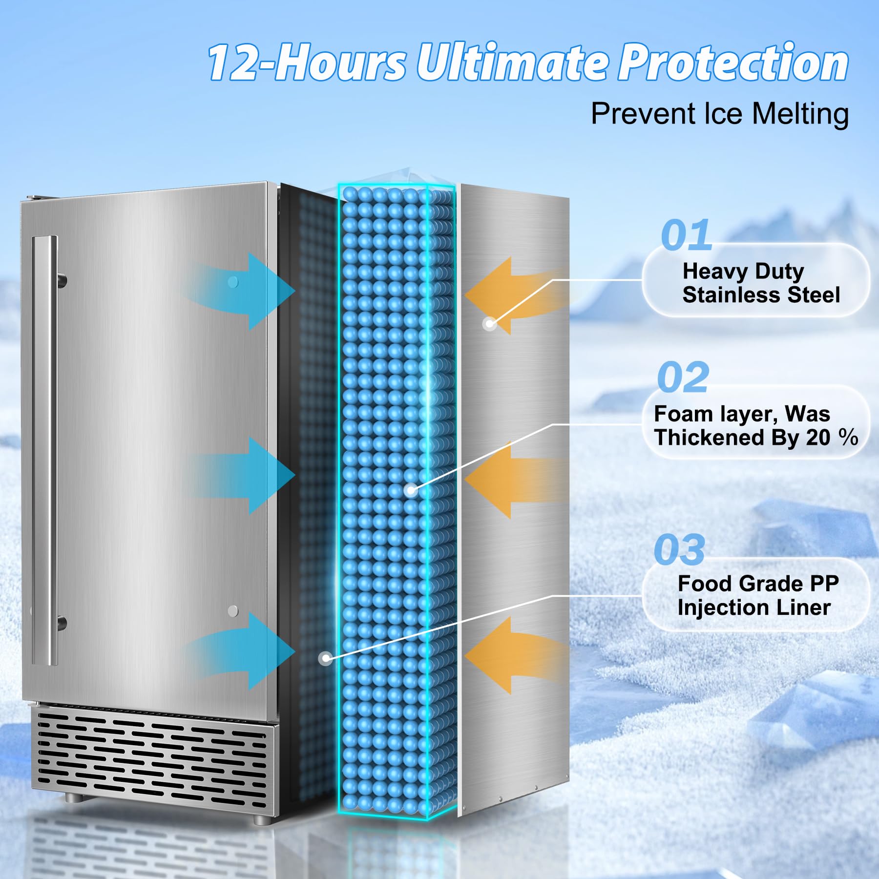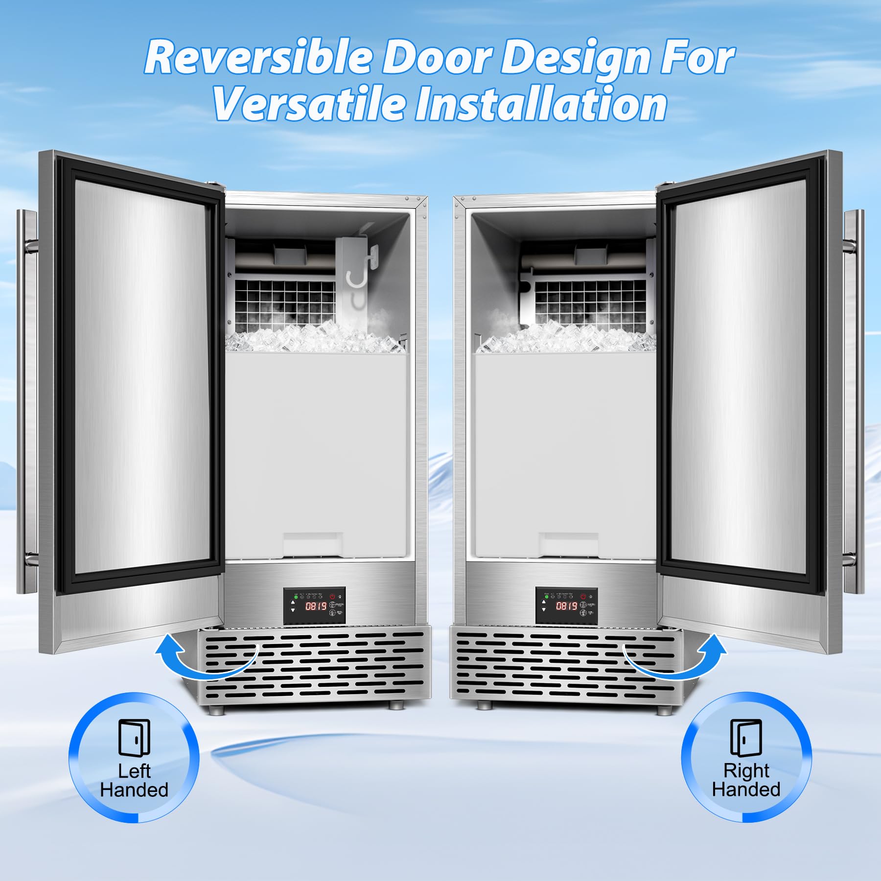Reversible Door & Cold insulation- The lce Machine stainless steel handle door can be installed in the left or right hinge, and the 3-layer material housing keeps the ice shape for a longer time to avoid melting.