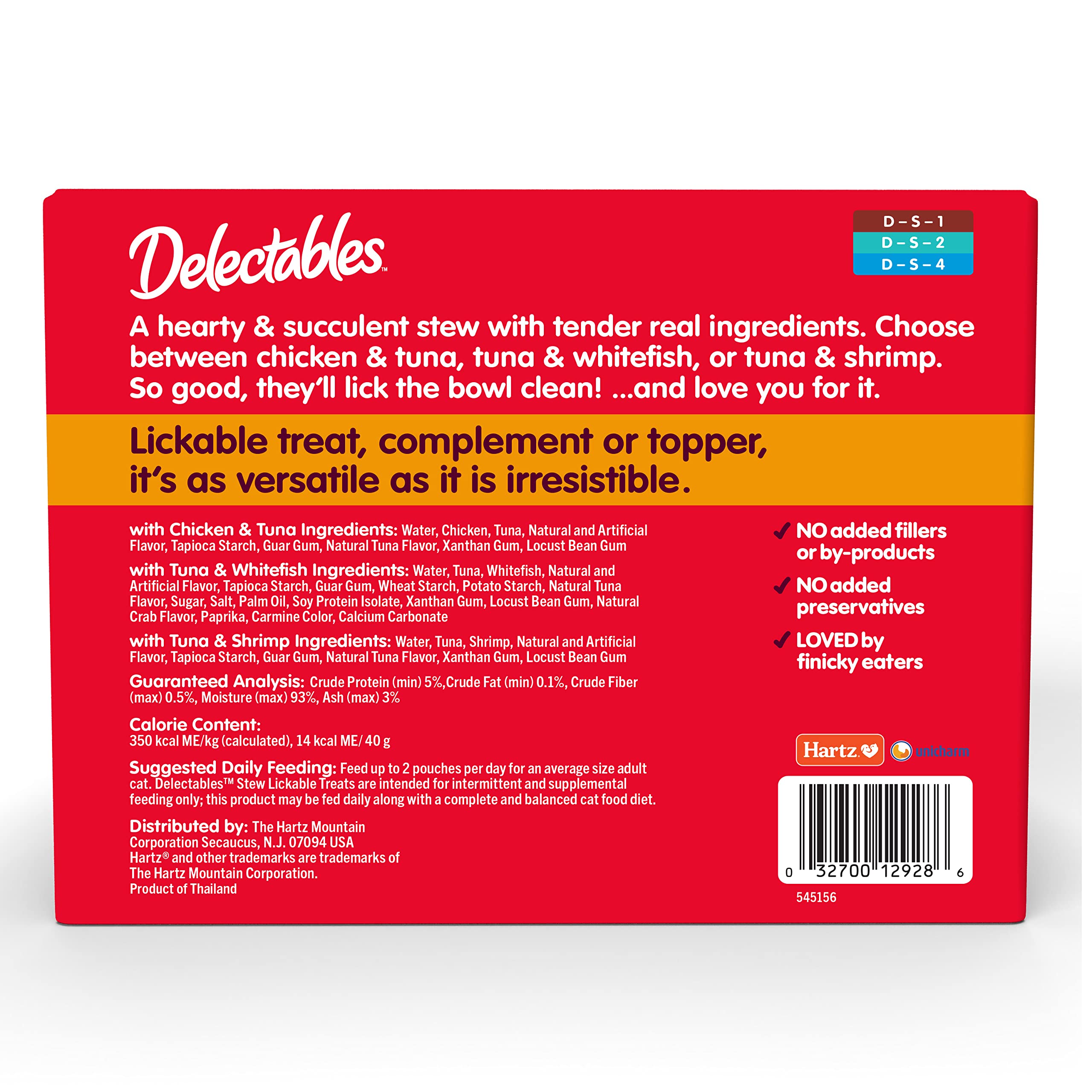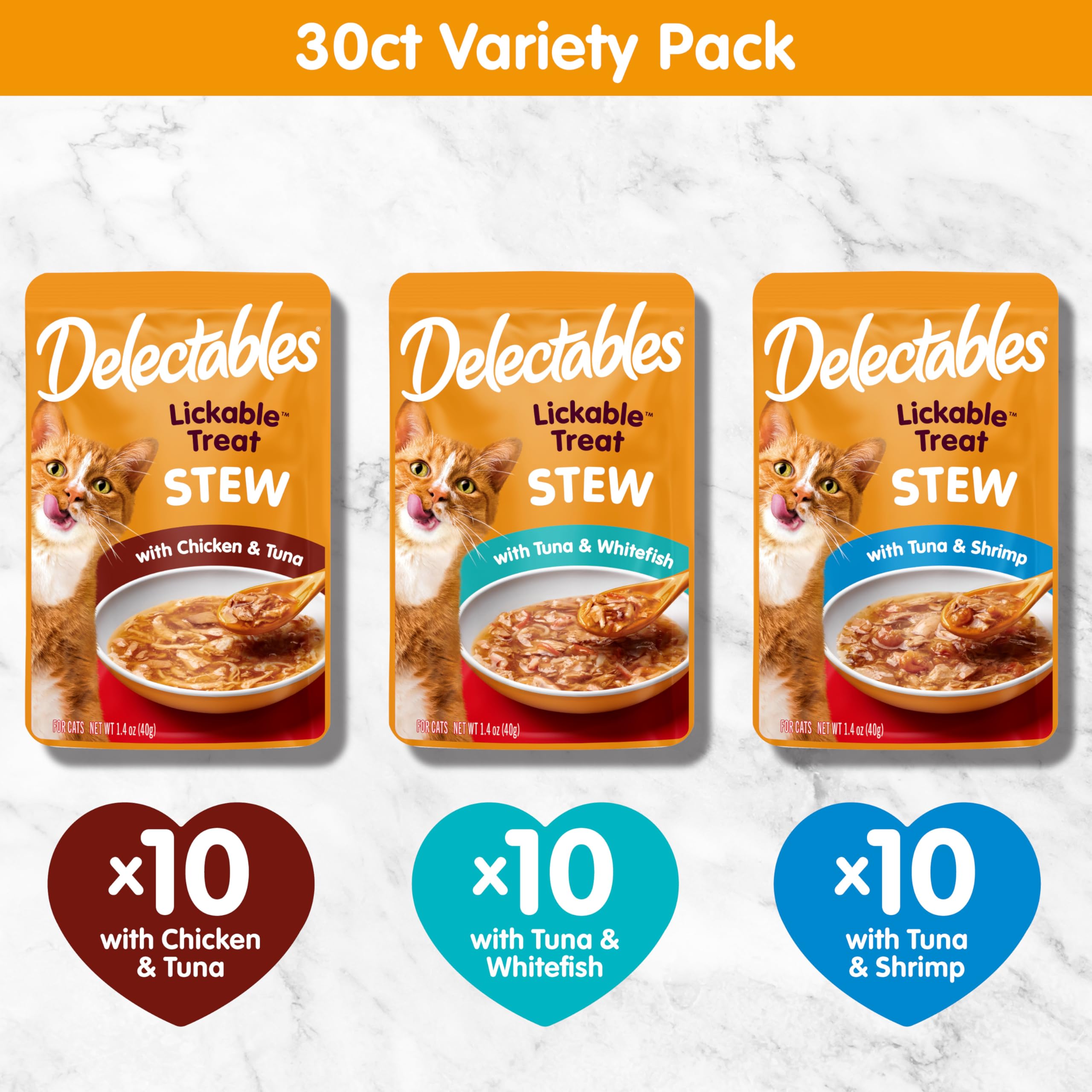 Delectables Lickable Treat Stew features a unique combination of real, tender ingredients in a hearty, succulent stew that'll have even the pickiest cats meowing for more! Crafted with premium wild-caught tuna, whitefish, shrimp and/or cage-free chicken, these treats offer a perfect mix of delicious nutrition and hydration boost. This innovative recipe perfectly blends the sauce and high-quality protein, so your cat can savor every delicious lick without leaving a drop behind. Serve these versatile treats as a tempting food topper, a quick snack, or a special reward. Delectables Lickable Treats are guaranteed to make your cat feel loved and satisfied.