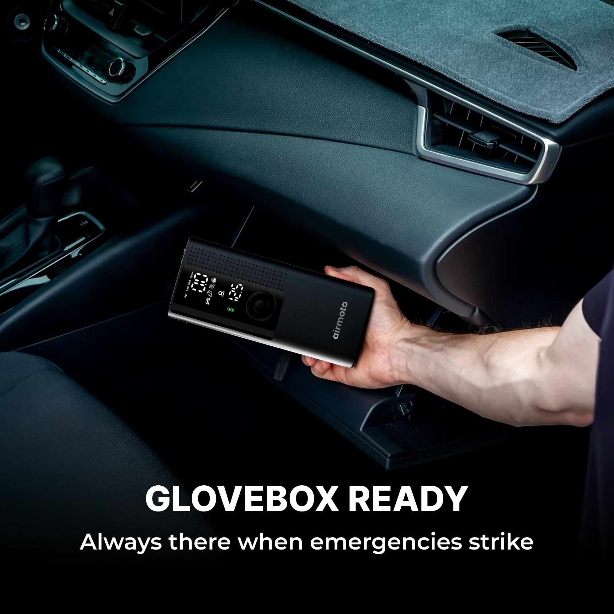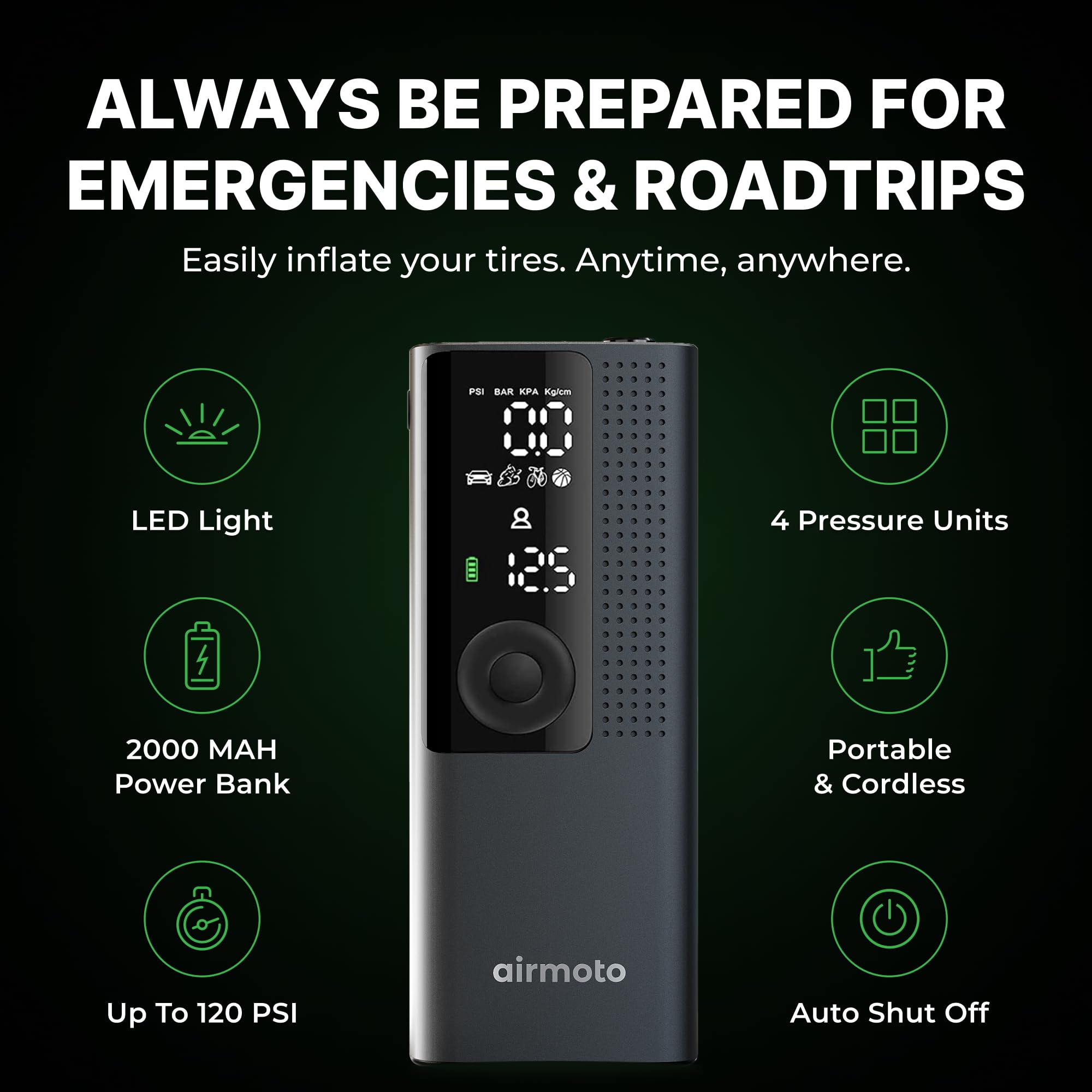 QUICK & ACCURATE: Built with the highest quality materials, Airmoto is a portable tire inflator for car, trucks, SUVs, motorcycles, and bicycles. Quickly inflate your vehicle's tires in just minutes with precision accuracy up to 120 PSI. Small and compact car air pump that fits in your glove box or trunk.