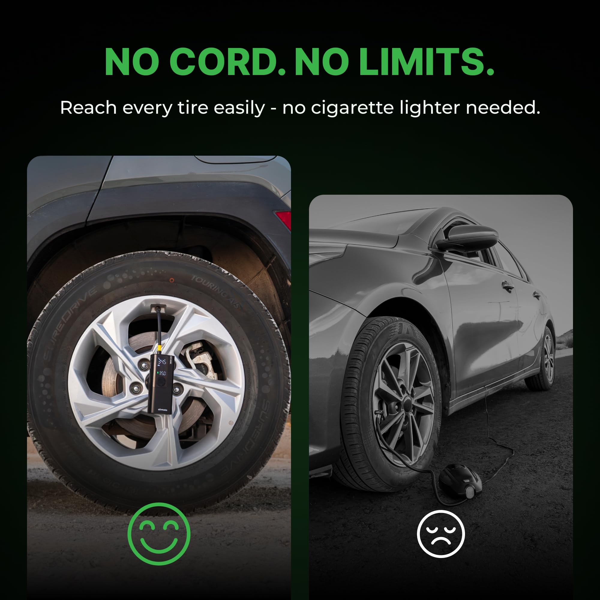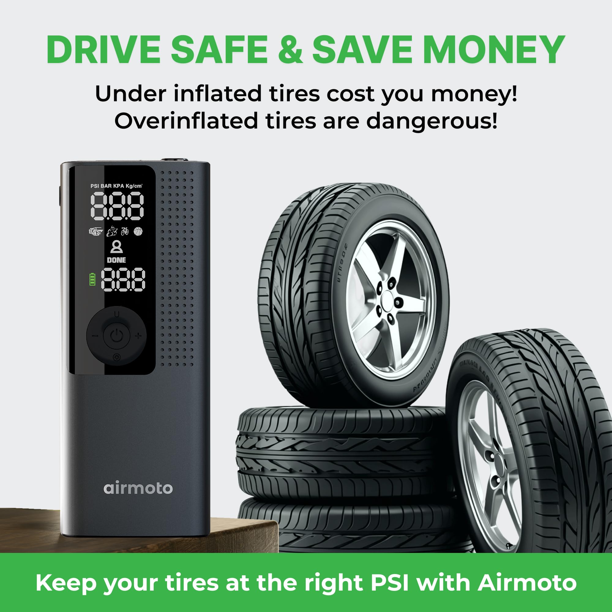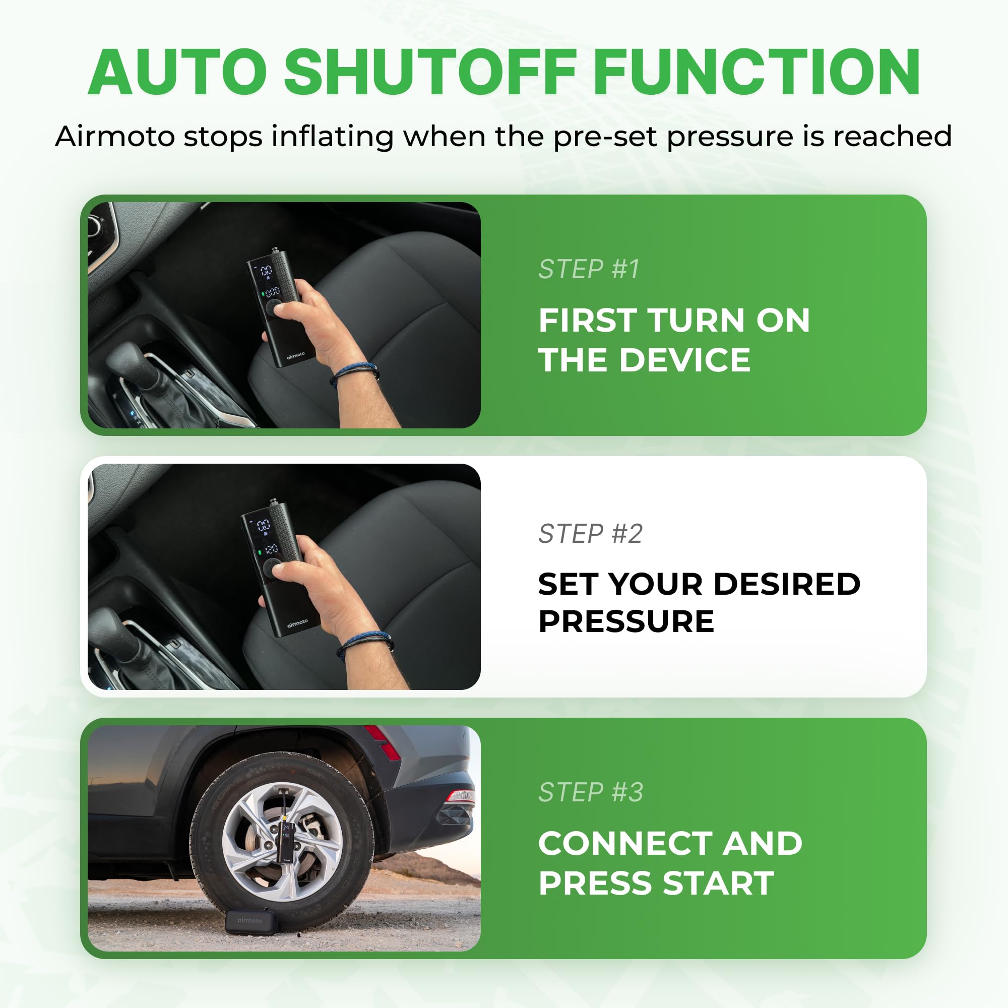 AUTO SHUT OFF: Use the “+” and “-” control buttons on the Airmoto to easily select your desired pressure, simply connect the air hose to your car and press the middle “Start” button on the electric air pump. Once the correct pressure has been reached the Airmoto will automatically shut off. The cordless car tire pump makes it easy to reach all tires without a hassle.