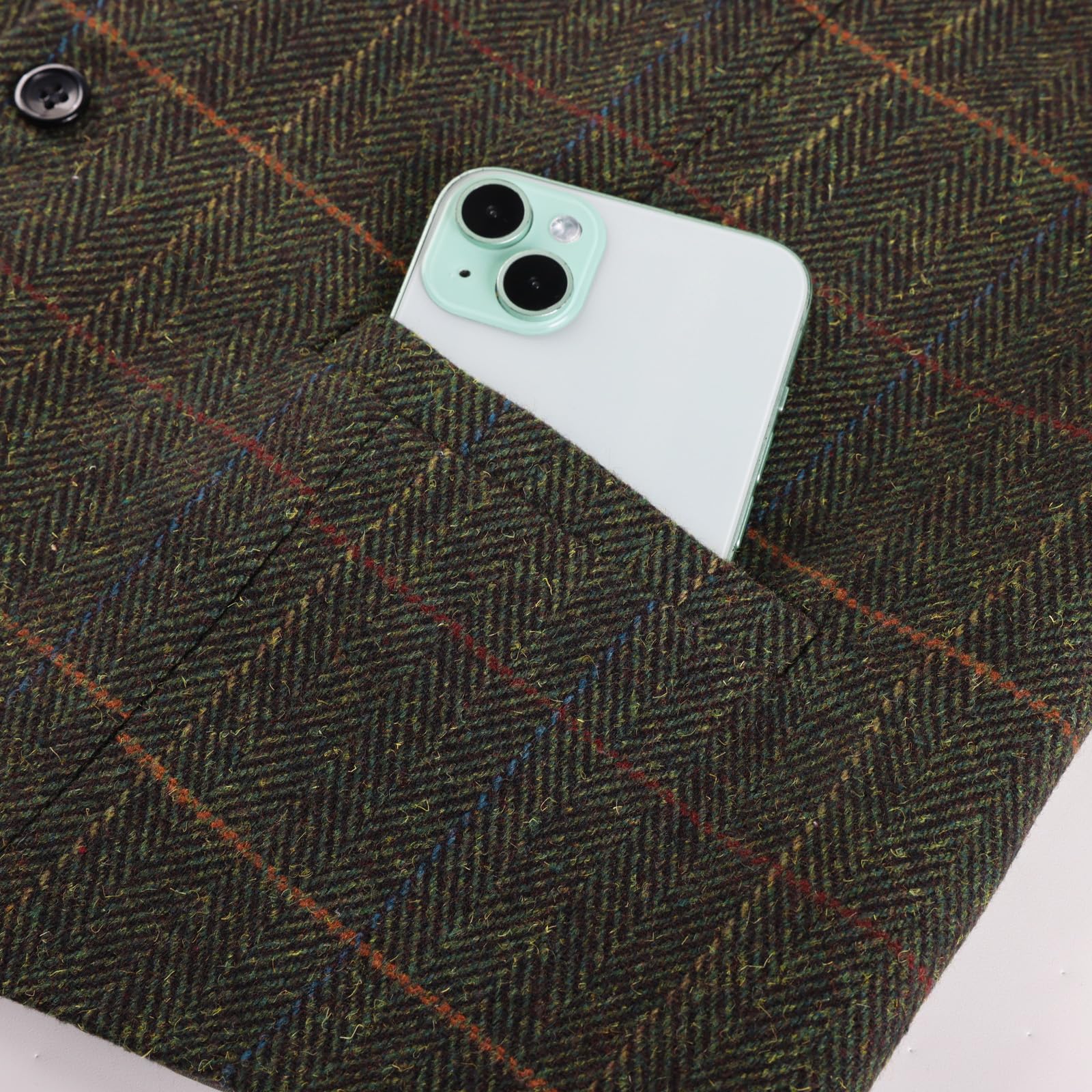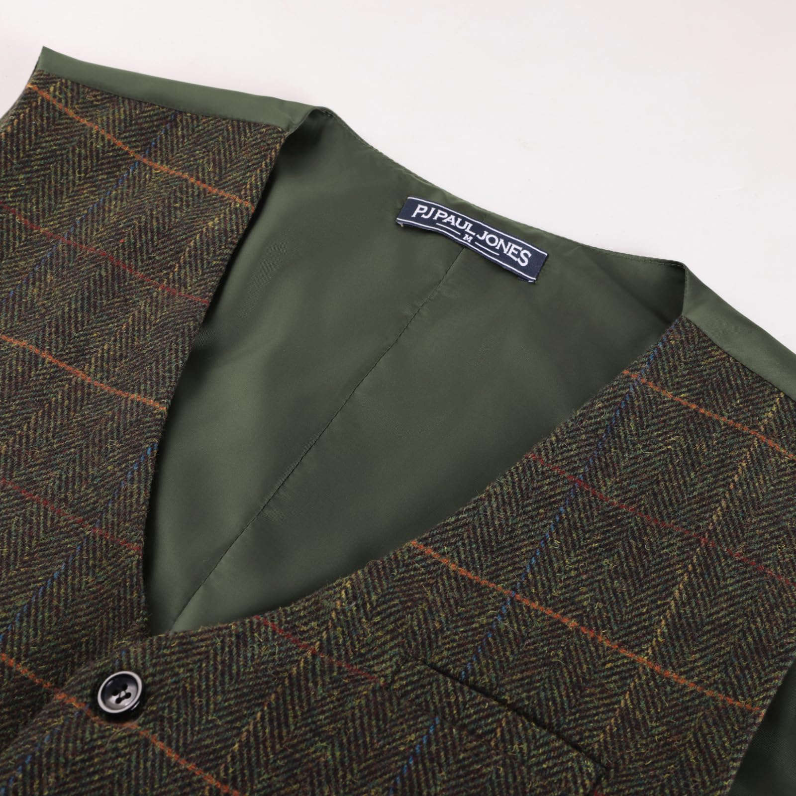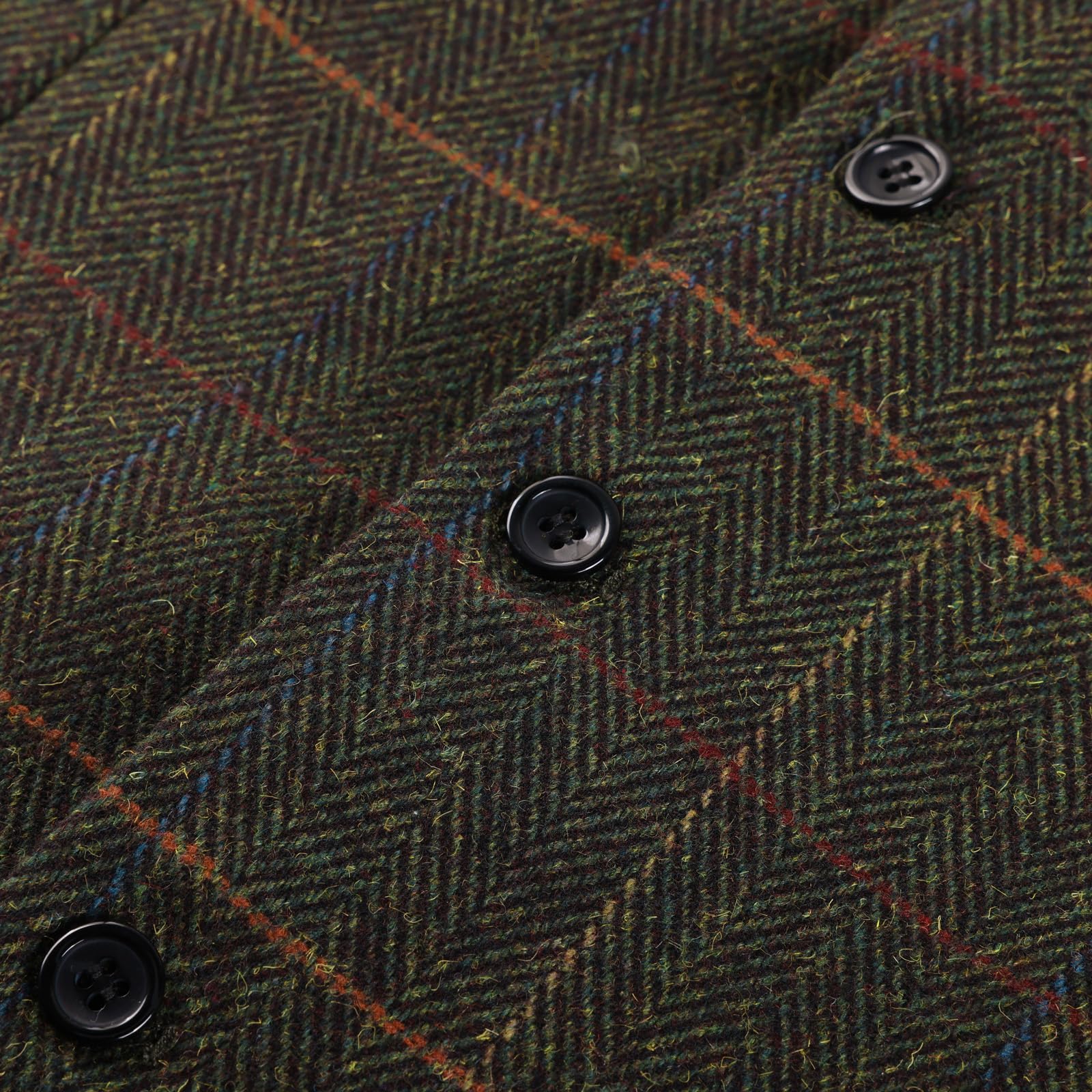 FEATURES: Sleeveless, v-neck, single breasted, handkerchief hem, three real pockets in the front, 5 buttons, wool blend, premium tailored, strap in the back waist, adjust for best fit, front is tweed fabric, back is satin, polyester lining