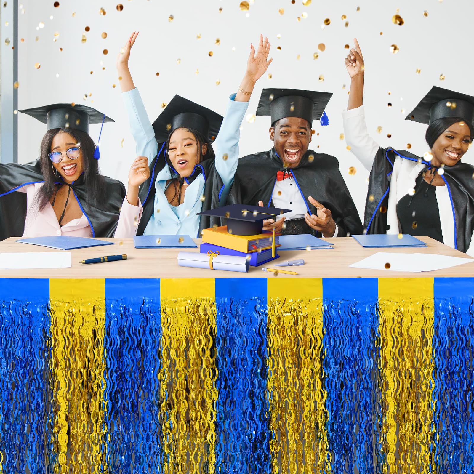 🎓【 WIDE OCCASIONS 】: Our Graduation-themed wavy foil fringe dessert table skirt adds a delight touch to your celebration. Perfect for Graduation and prom parties, its shimmering design creates an unforgettable atmosphere for any occasion.