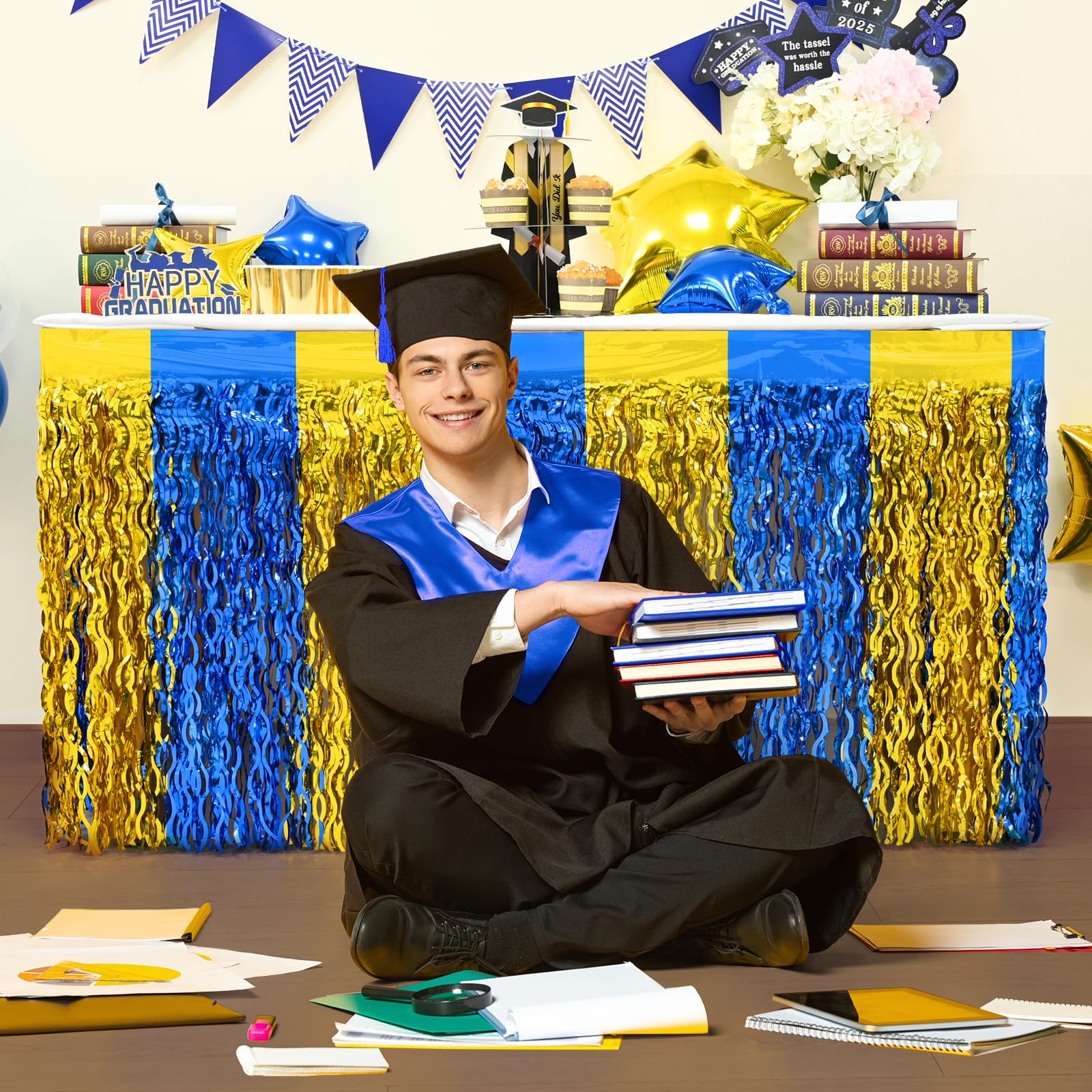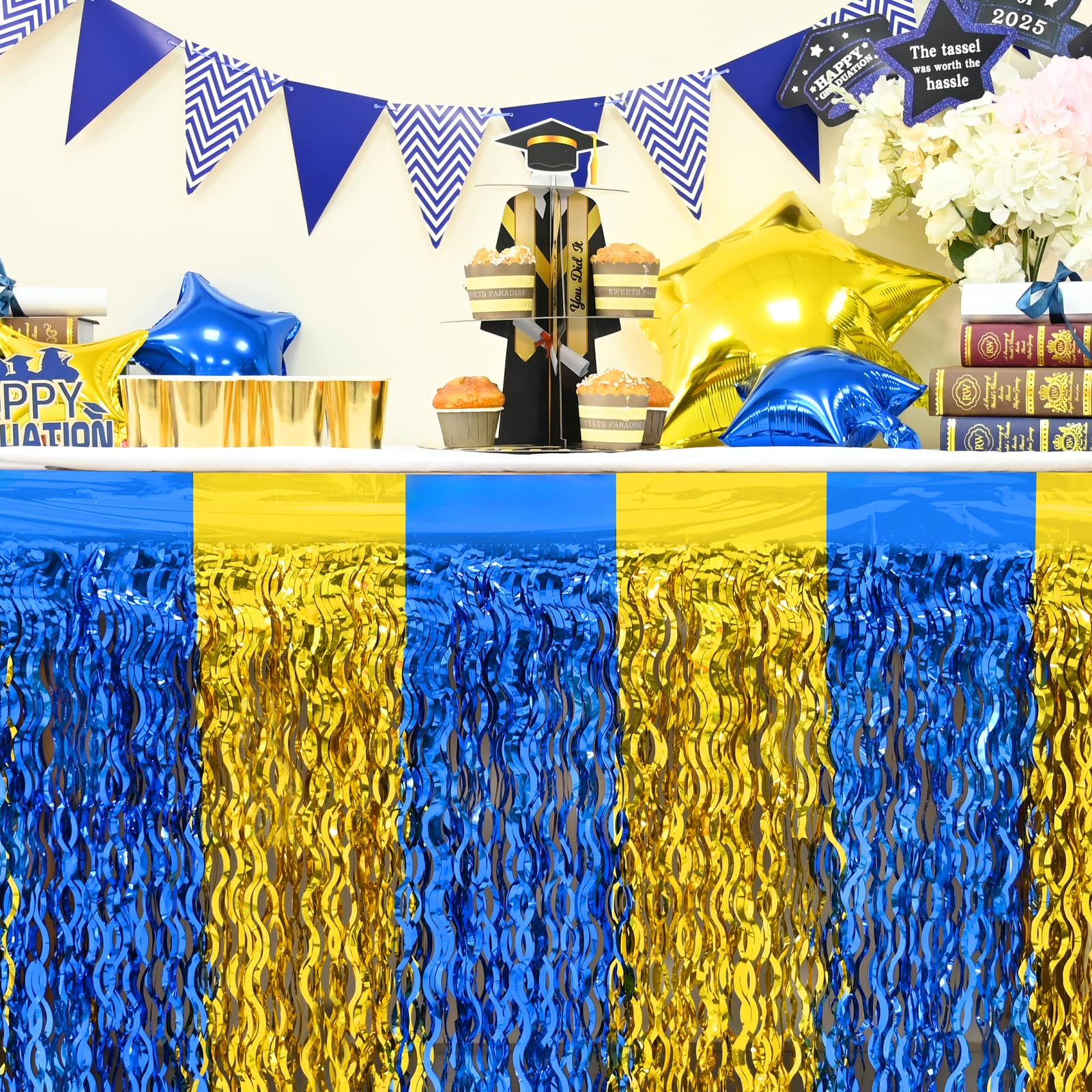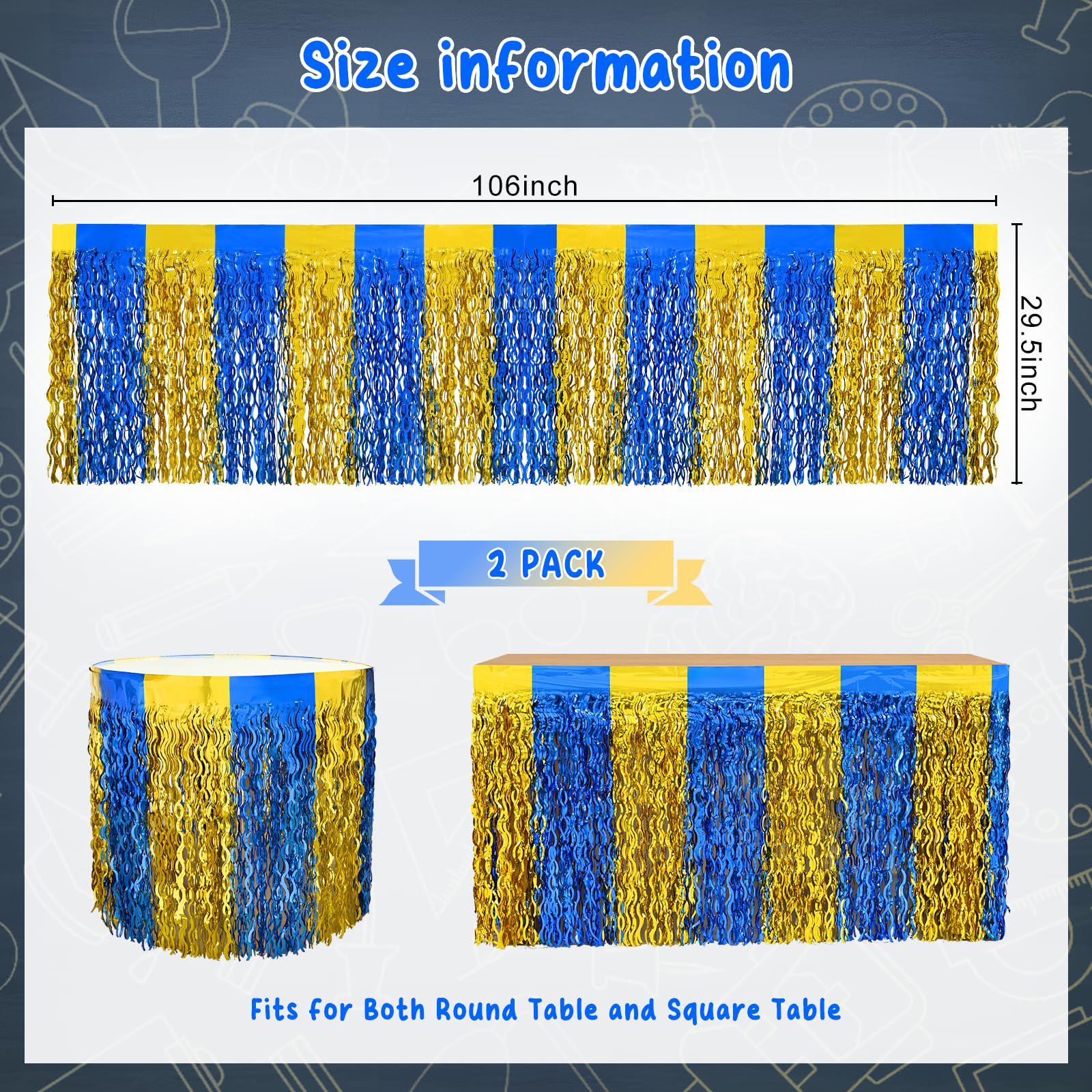 🎓【 PACKAGE 】: Including 2 pack blue gold foil fringe table skirts. Each skirt measures 106 x 29.5 inches (width x drop), providing you with ample coverage to adorn your party tables.