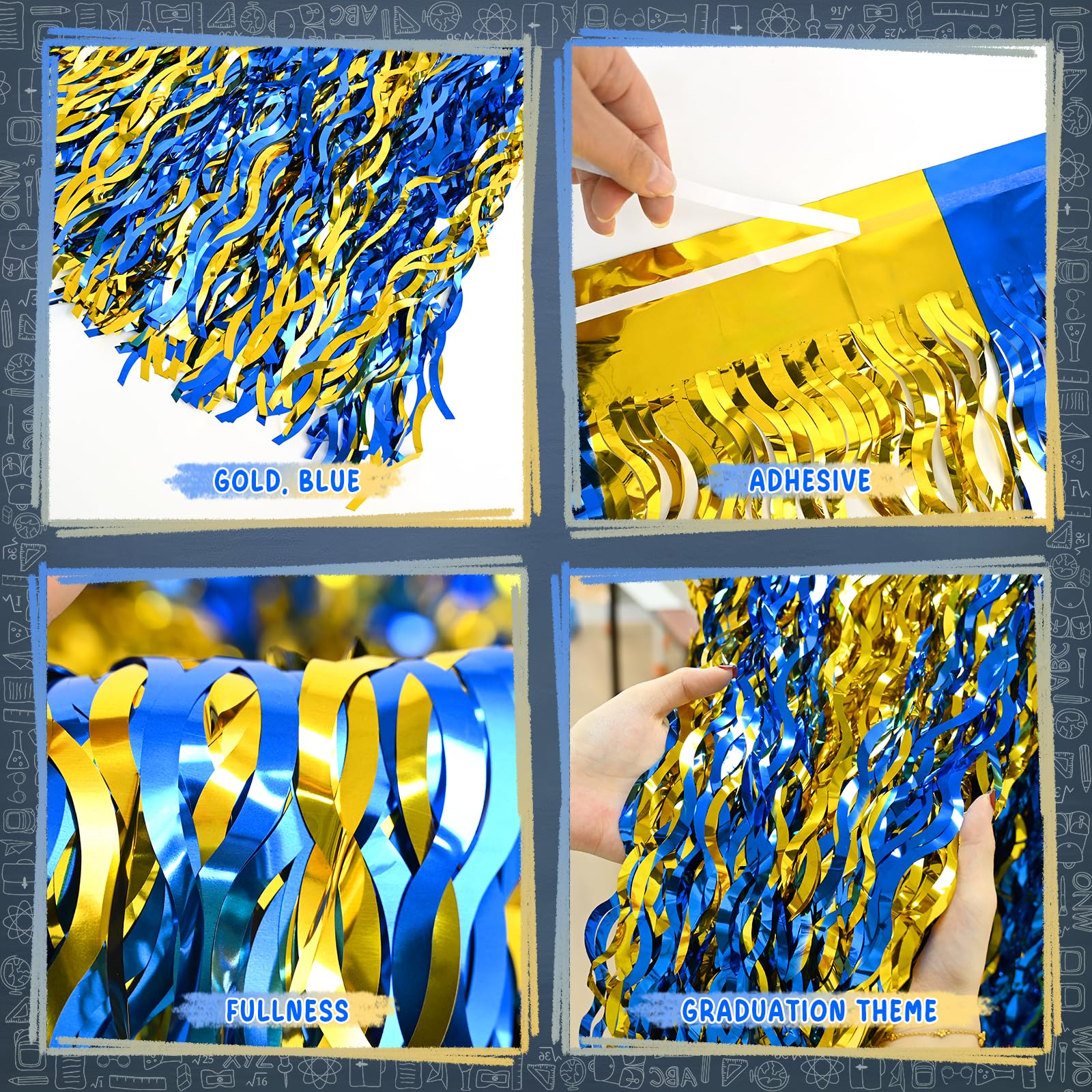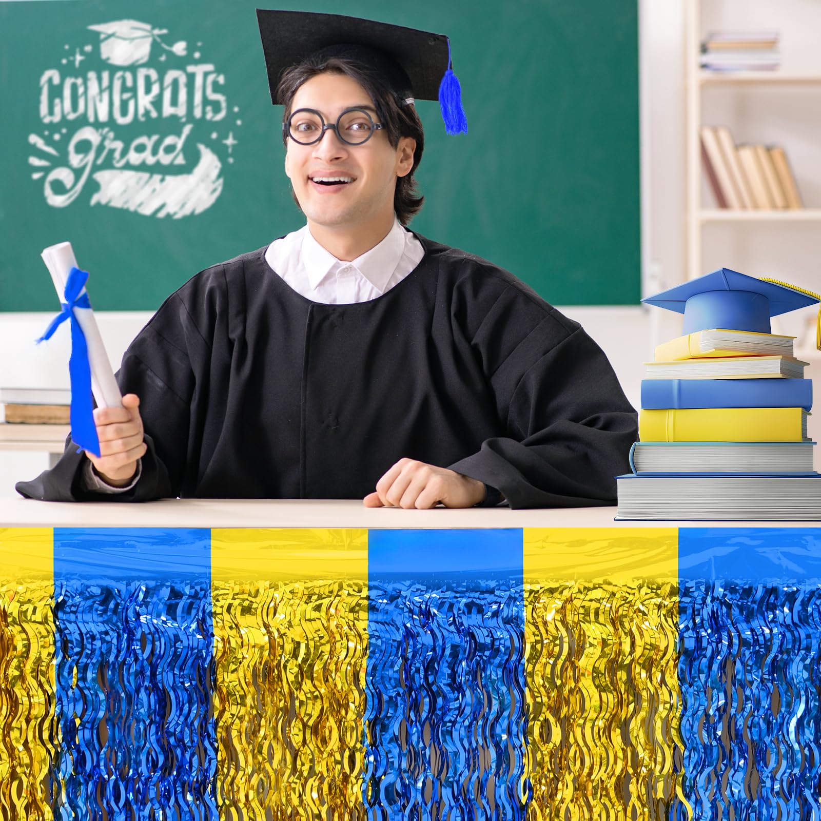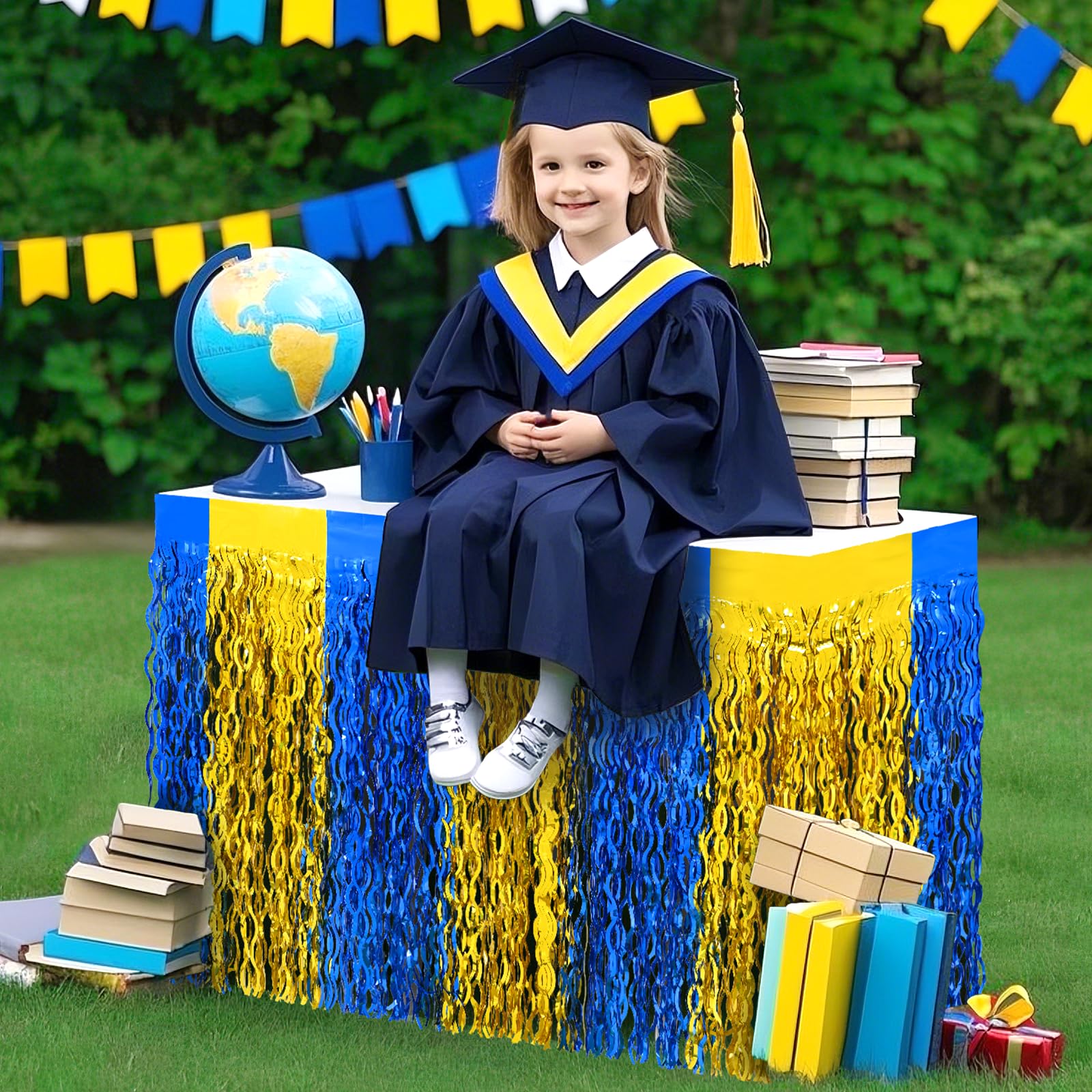 🎉【 TINSEL MATERIAL 】: Our Graduation-themed metallic foil fringe table skirt are made of high-quality tinsel material. Its shiny surface adds a touch of sparkle to your Graduation decorations, while its lightweight and durable design ensures longevity.