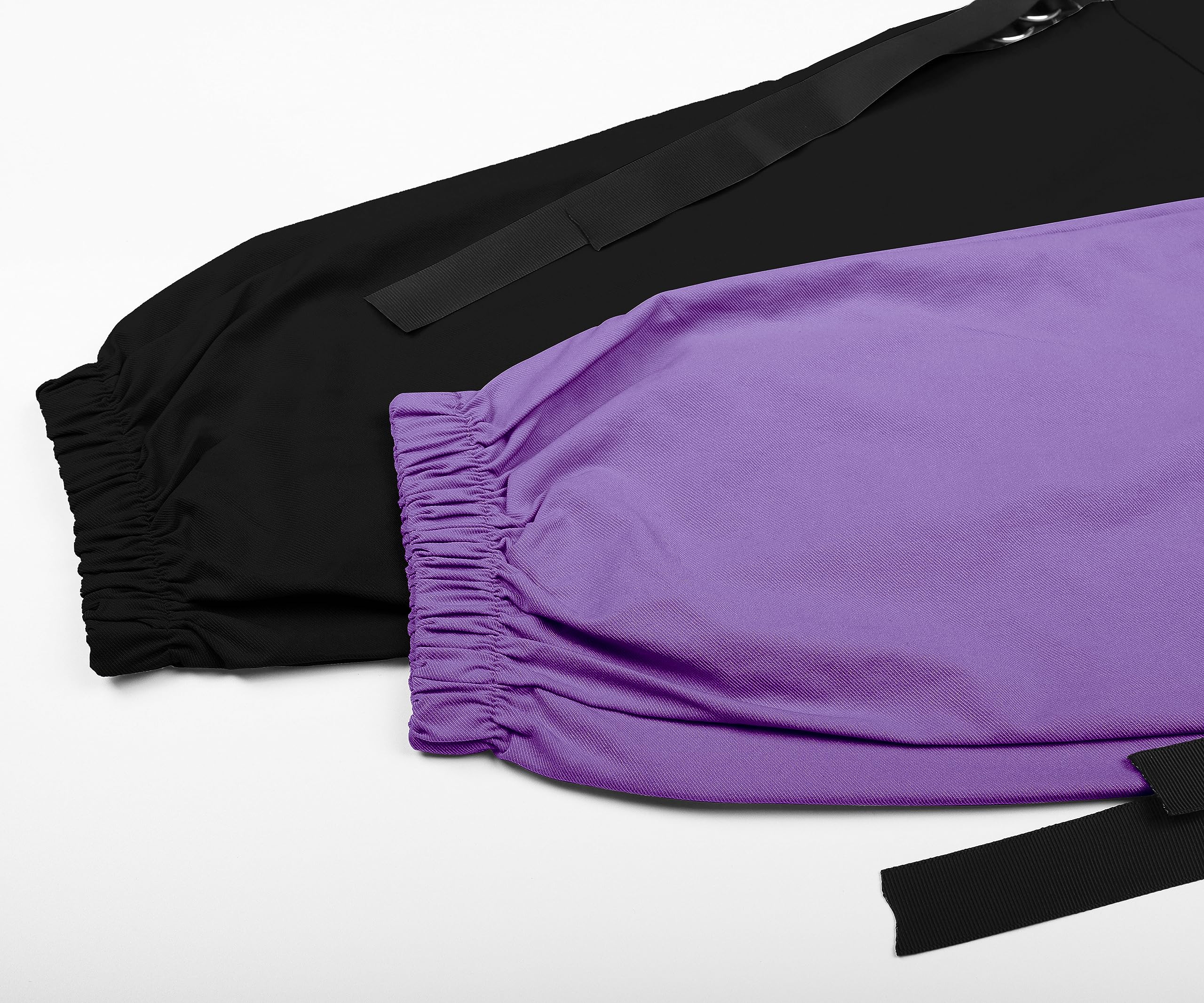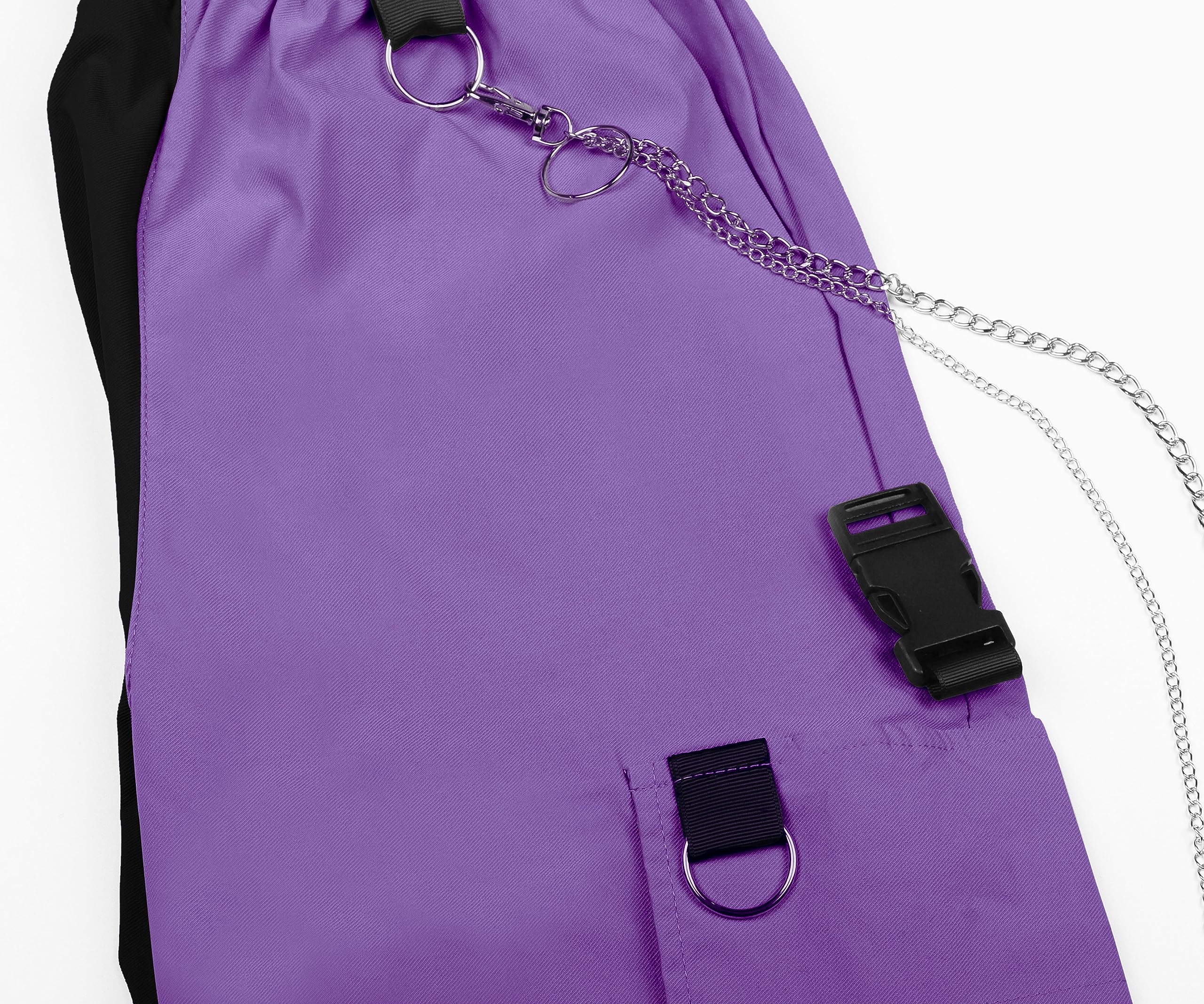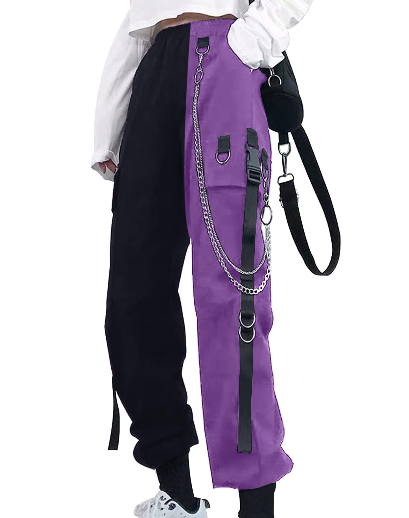 [Feature] Special black and purple patchwork pants design, highlighting your personality. High waisted cargo pants with chain, streetwear pants for women. The high waist overalls design with wide legs shows off your figure and creates a sexy and trendy look. The elastic waist ensures a perfect fit, and the multiple pockets provide ample storage space. Put on these emo pants and embrace a cooler and casual style