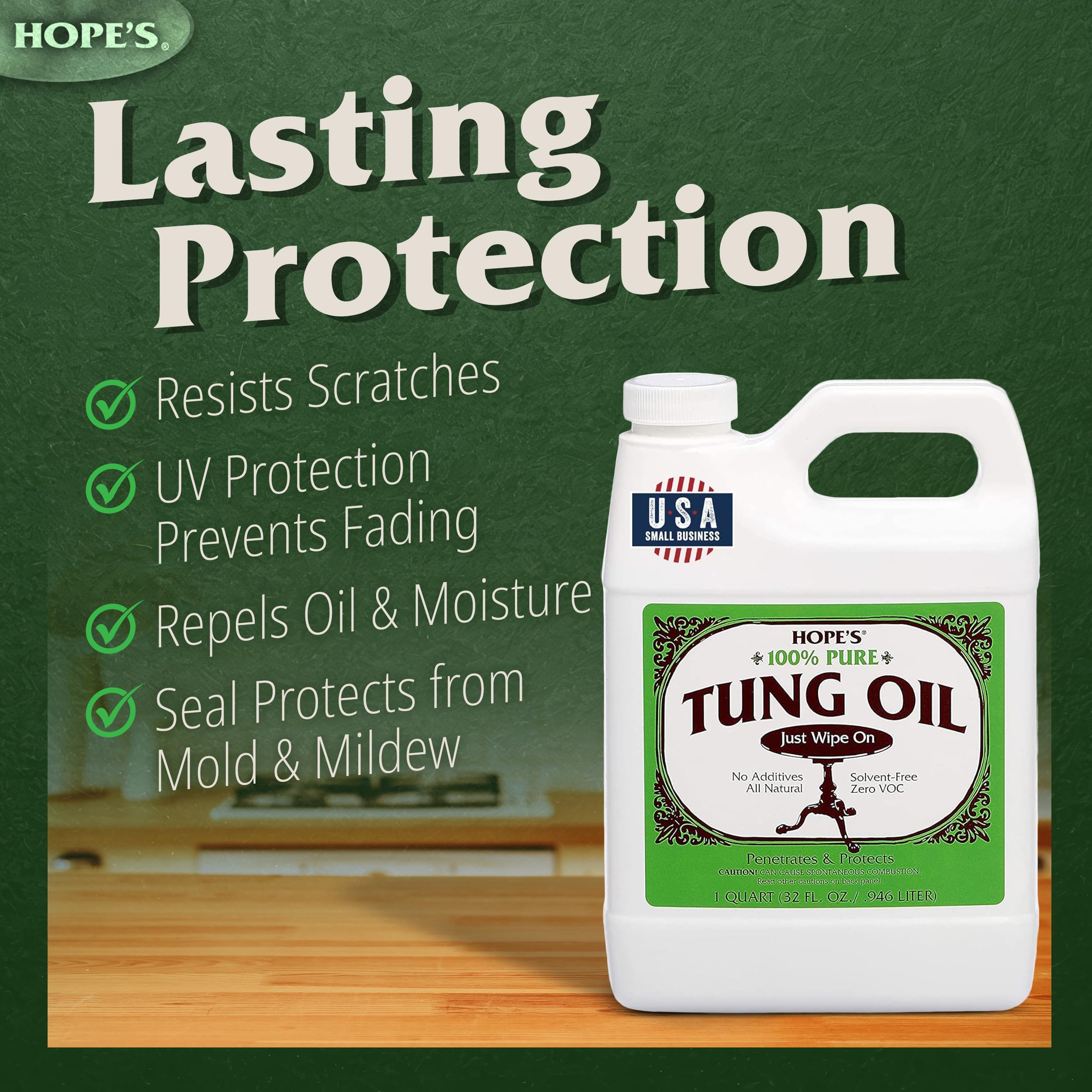 Easy to Use - Tung oil is a natural oil recognized by craftsmen to offer the ultimate hand-rubbed finish for all fine woods; just wipe on and allow the oil to cure at room temperature
