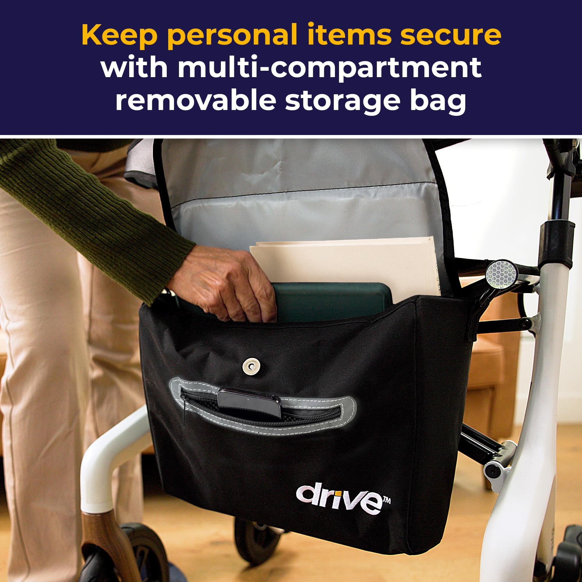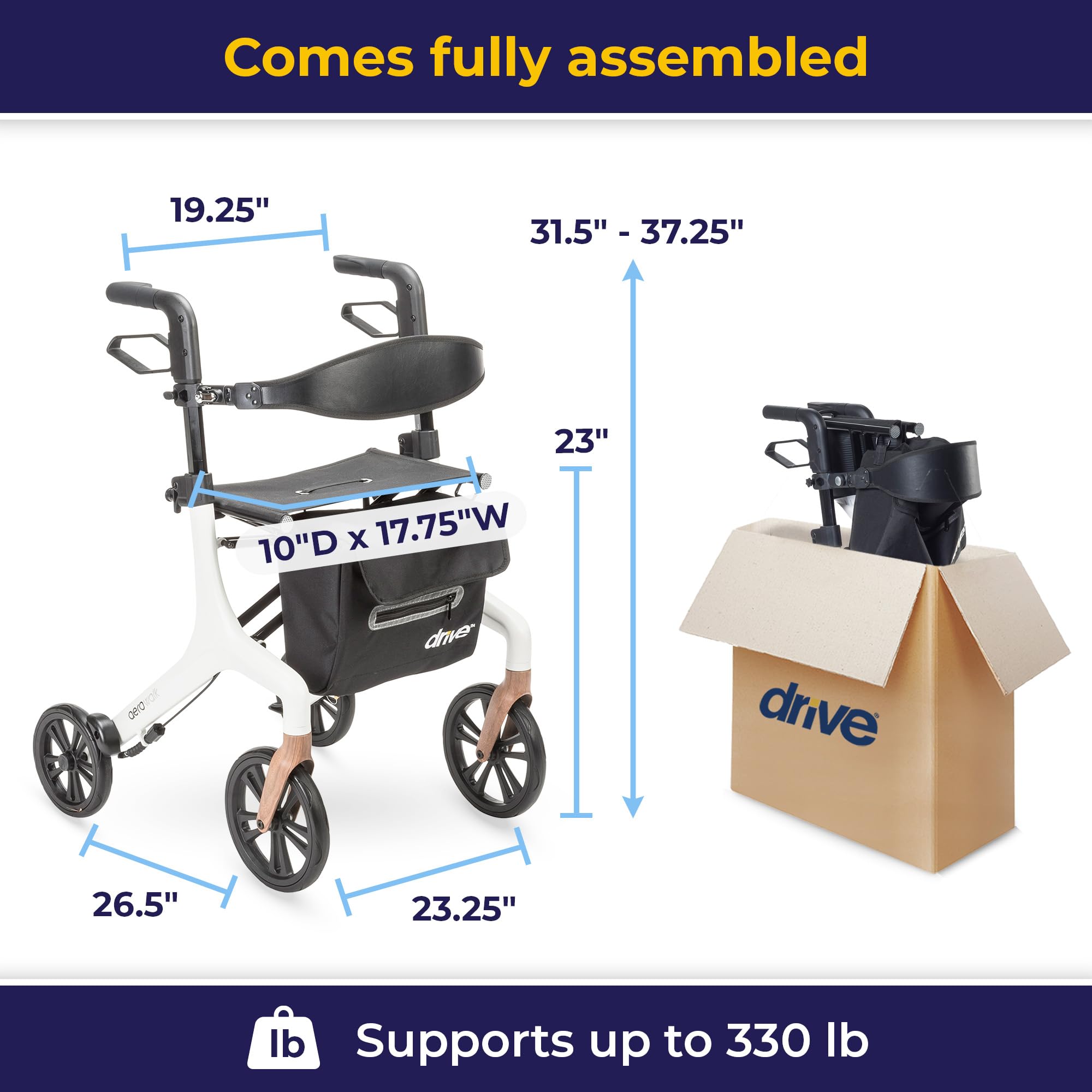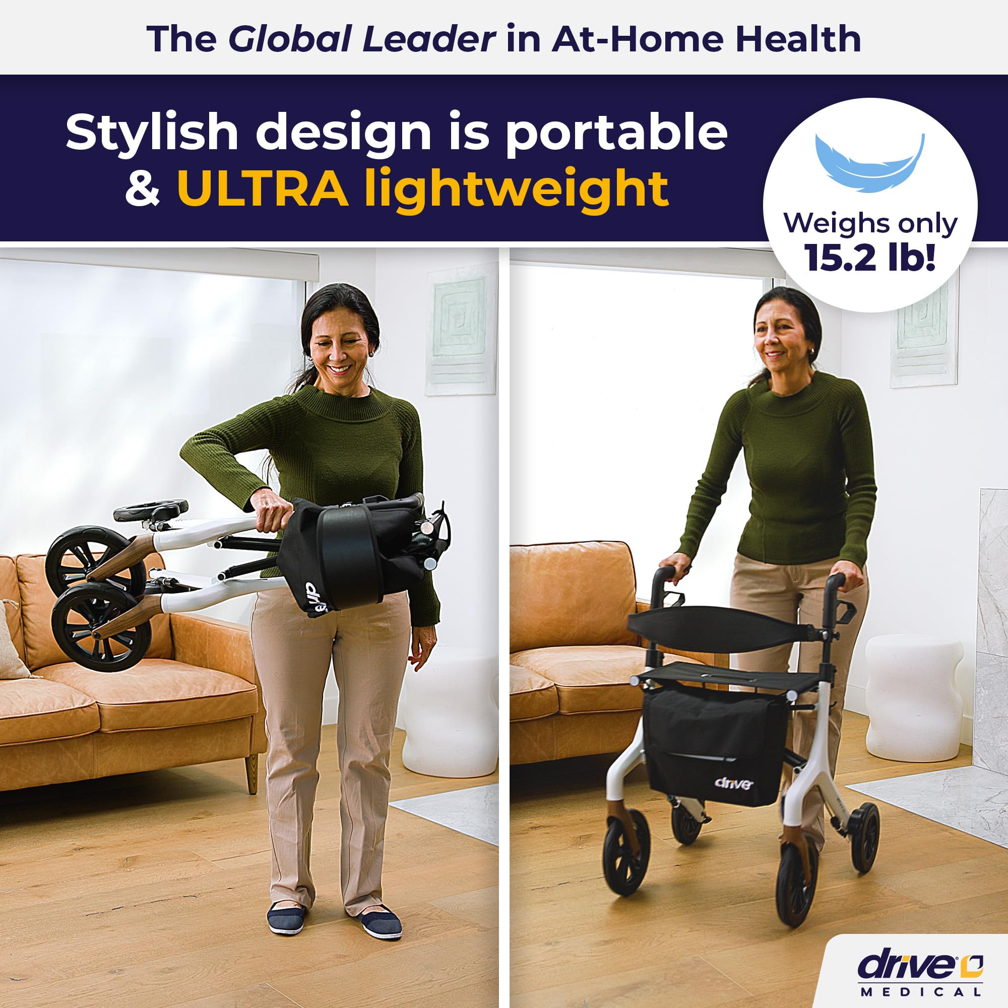 The AeroWalk Ultra-Lite foldable rollator with seat gives users the freedom to move in style. The stylish seamless frame with no visible welds offers superior durability. Designed with a strong yet lightweight frame and large wheels, this rolling walker offers smooth and stable maneuverability on both indoor and outdoor terrain. Enclosed brake cables provide streamlined, worry-free navigation. The built-in seat provides the perfect place to rest during longer outings, while a unique, height-adjustable backrest extends to offer customizable support for added comfort. Weighing just 15.2 pounds, this folding rollator is easy to lift, store, and transport, thanks to its compact side-to-side fold. The 4-wheeled walker also includes a spacious, removable storage bag with plenty of room for your daily essentials. Let the AeroWalk Rollator lighten your step today!