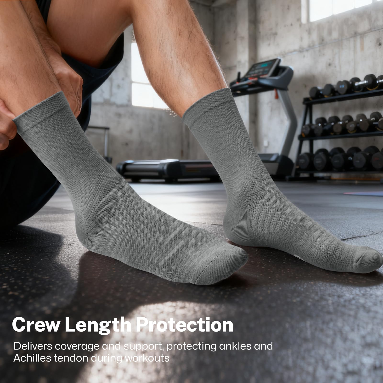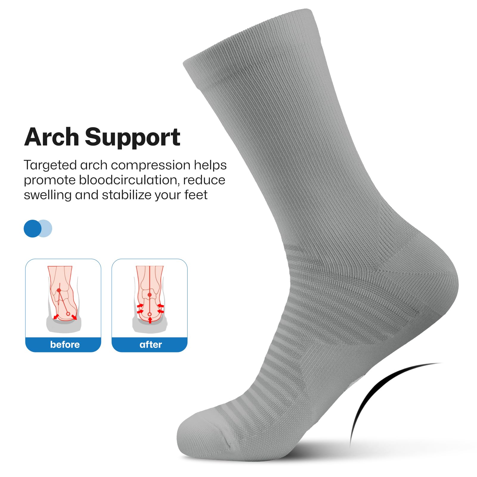 [TARGETED COMPRESSION ZONES] Compression is proven to improve blood flow, move faster, react quicker, and use less energy. Targeted compression zones(8-15mmHg) provide varying levels of support from moderate to extra firm. These compression socks are designed to promote blood circulation and oxygen flow preventing cramping, fatigue, swelling, helps in muscle recovery, and preventing fasciitis