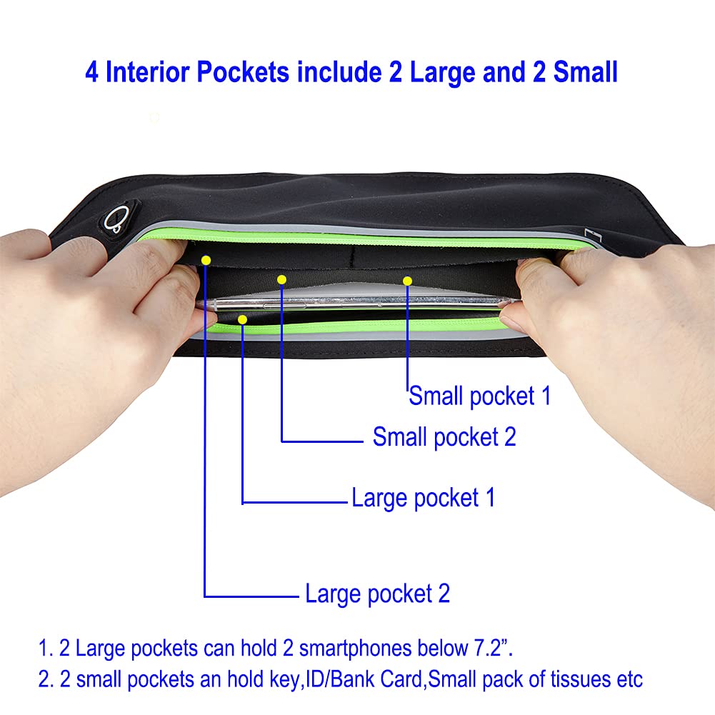 【Large Capacity,4 separate pockets】The waist pouch bag has 4 separate pockets including 2 large main pockets and 2 Small pockets, keep your cell phone from scratches.The running waist pack can hold phone,passport,keys,ID card,credit cards, money,tissue etc. it is a perfect running belts for women men.