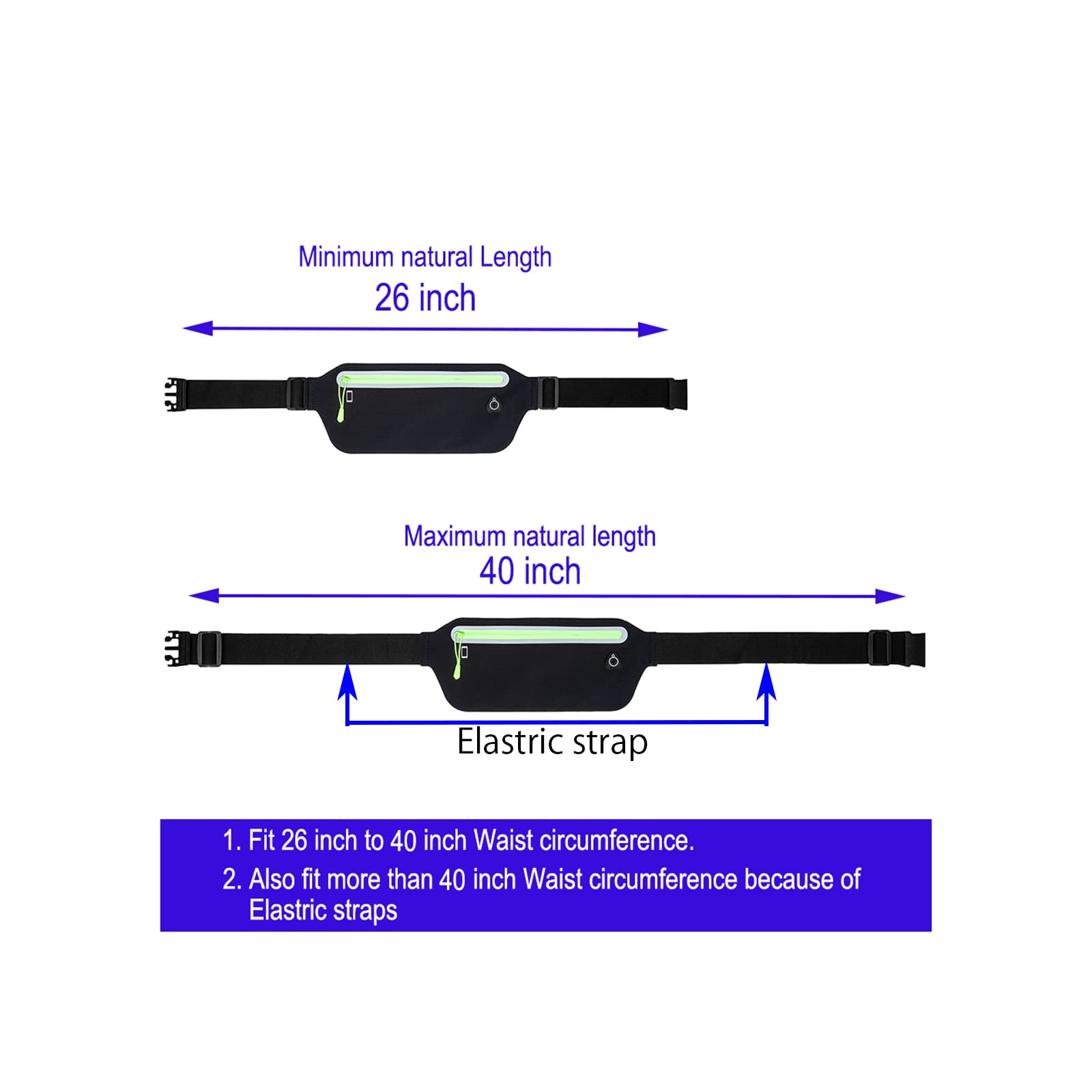 【Adjustable,Fits All waist Sizes】the worktout fanny pack has an Adjustable elastic band,the natural length is from 26 inch to 40 inch,The workout fanny pack can fit more than 40" Waist because of the good elastic bands. it is universal fitness waist belt bag for women men.