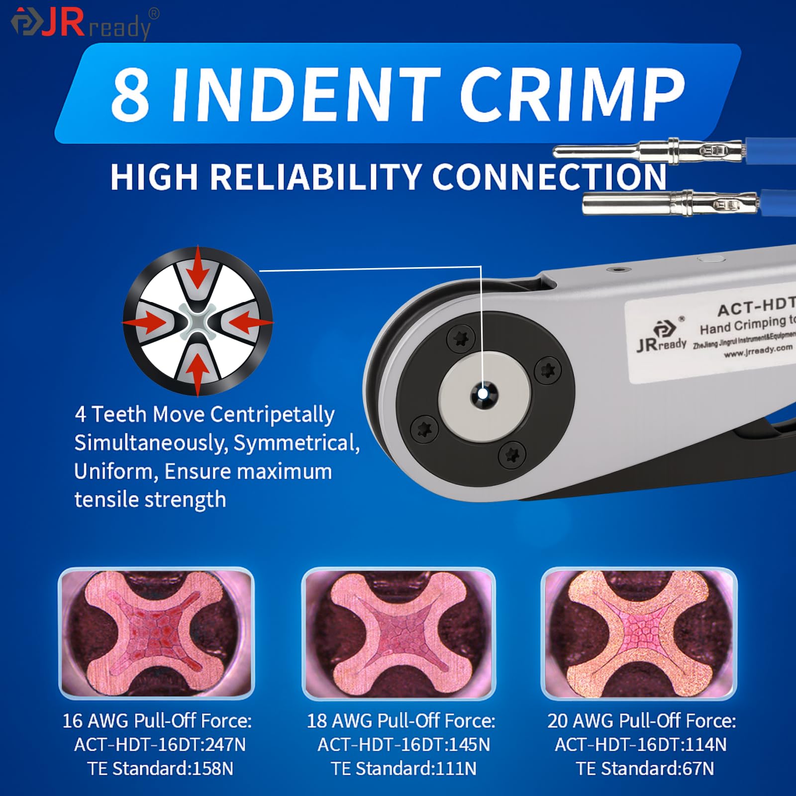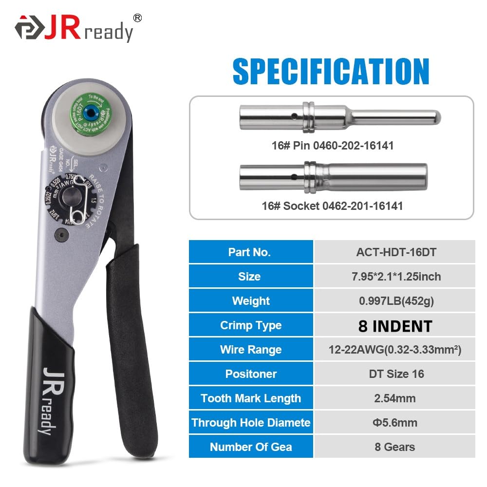 【Pro-Grade 8-Indent Deutsch Crimp Tool 】ACT-HDT-16DT 8-indent ratchet crimper delivers professional crimps on size-16 pins. Adjustable 8-position dial for 12–22 AWG ensures precise connections every time. Crimping effect is equivalent to HDT-48-00.