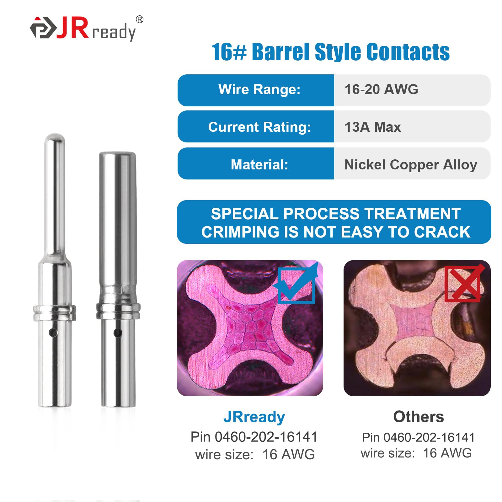 【16# Deutsch Solid Contacts】High-conductivity copper-alloy pins with corrosion-blocking nickel coat maintain low resistance and cool temperatures, delivering a steady 13 A on 16-20 AWG leads and adding years of reliability to any harness.