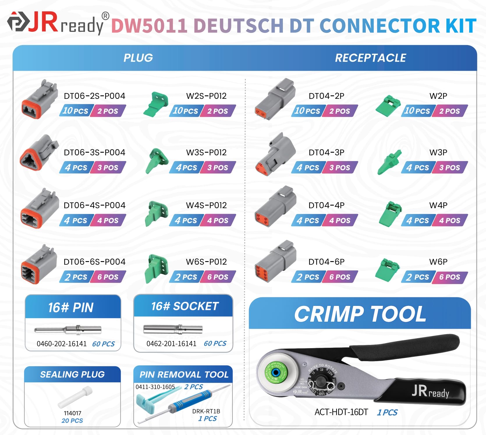 【IP68 Deutsch connector kit 】covers 85 % of daily wiring: 2-6 pin DT connector, 60 Pairs 16# solid contacts, ACT-HDT-16DT 8-indent crimper & pin-removal tool—build waterproof automotive,Jeep, ATV, trailer, and boat wiring harnesses fast.