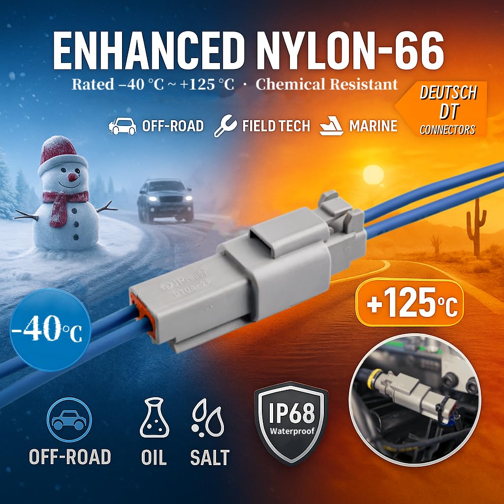 【Survives Heat, Cold & Corrosion】Glass-fiber-reinforced Nylon 66 housings seal to IP68, resist oil, salt and fuel, and stay tough from –40 °C to +125 °C. Each size-16 contact carries 13 A continuous, keeping race cars, UTVs and boats powered in the harshest conditions.