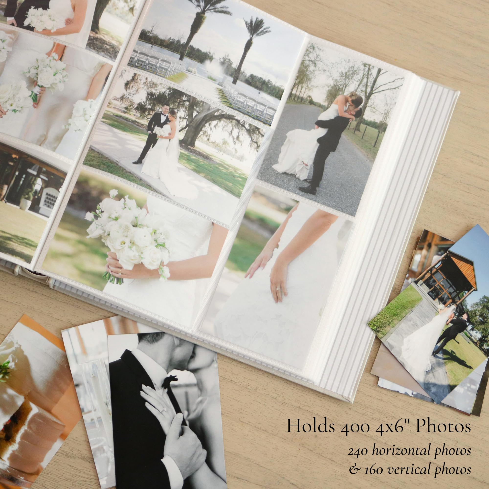 FITS 400 WEDDING DAY PHOTOS – Large size capacity with pocket sleeves for 240 horizontal and 160 vertical photos, each page holds 3 horizontal and 2 vertical photos. 80 pages total (40 sheets).