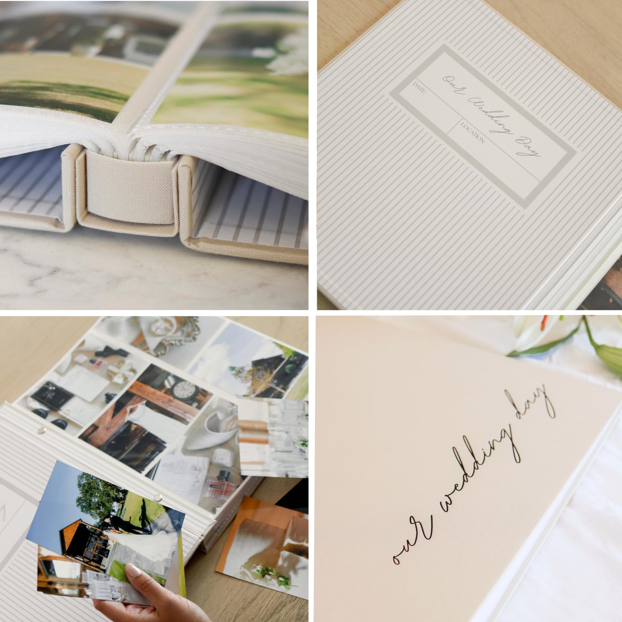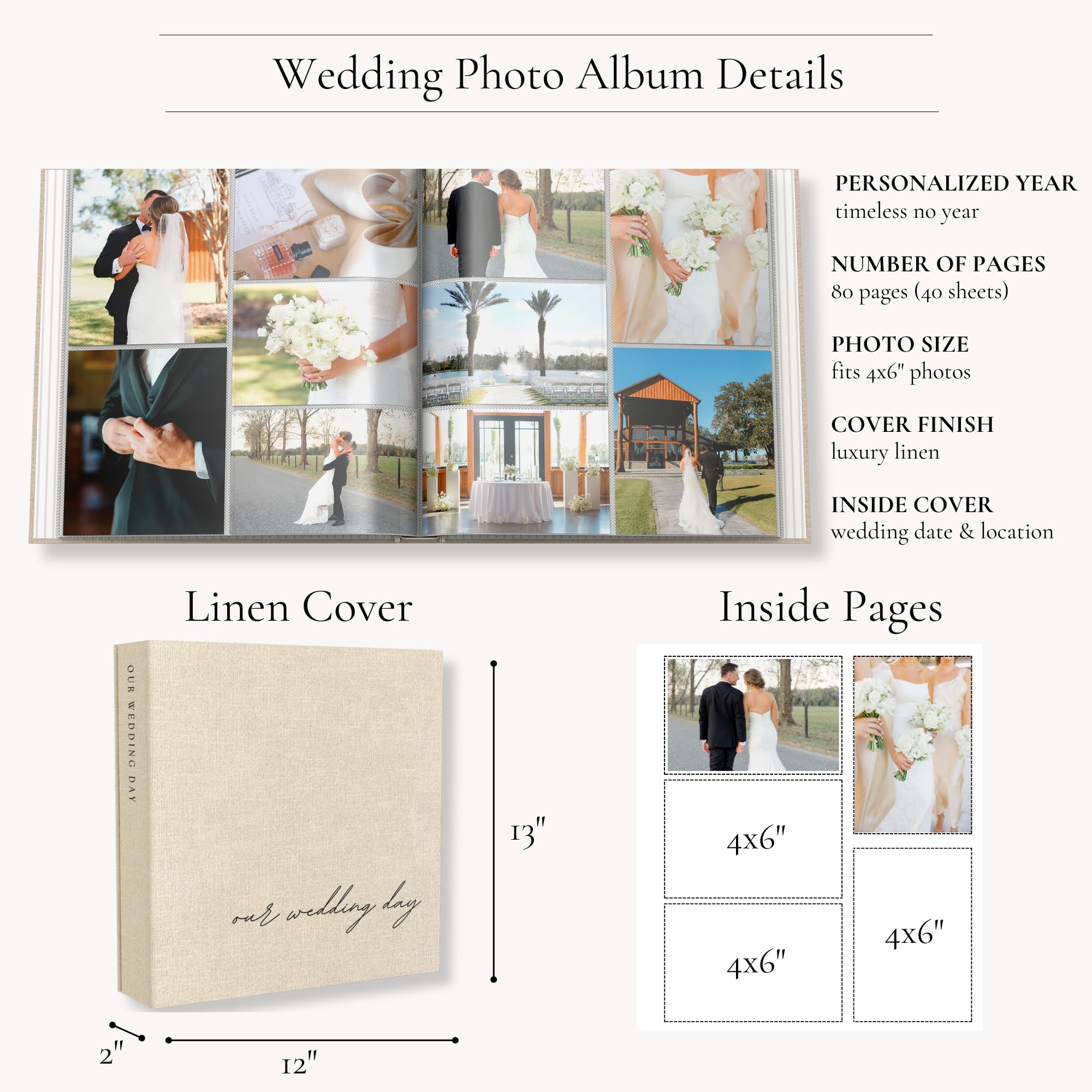 BEAUTIFUL BEIGE LINEN COVER: Crafted with a durable hard linen cover in a neutral light beige to complement any home aesthetic. Embossed on the cover and spine to display on a table of bookshelf. Picture album size is 13"x12"x2".
