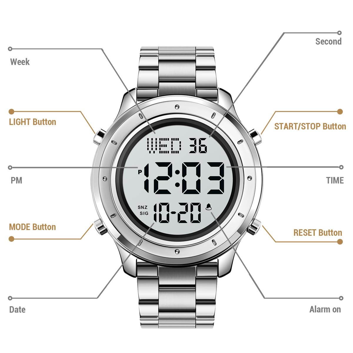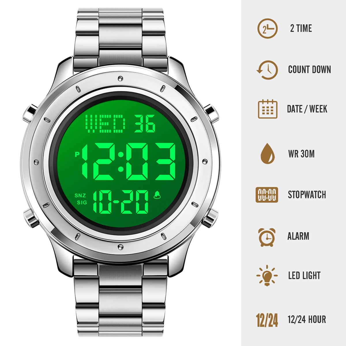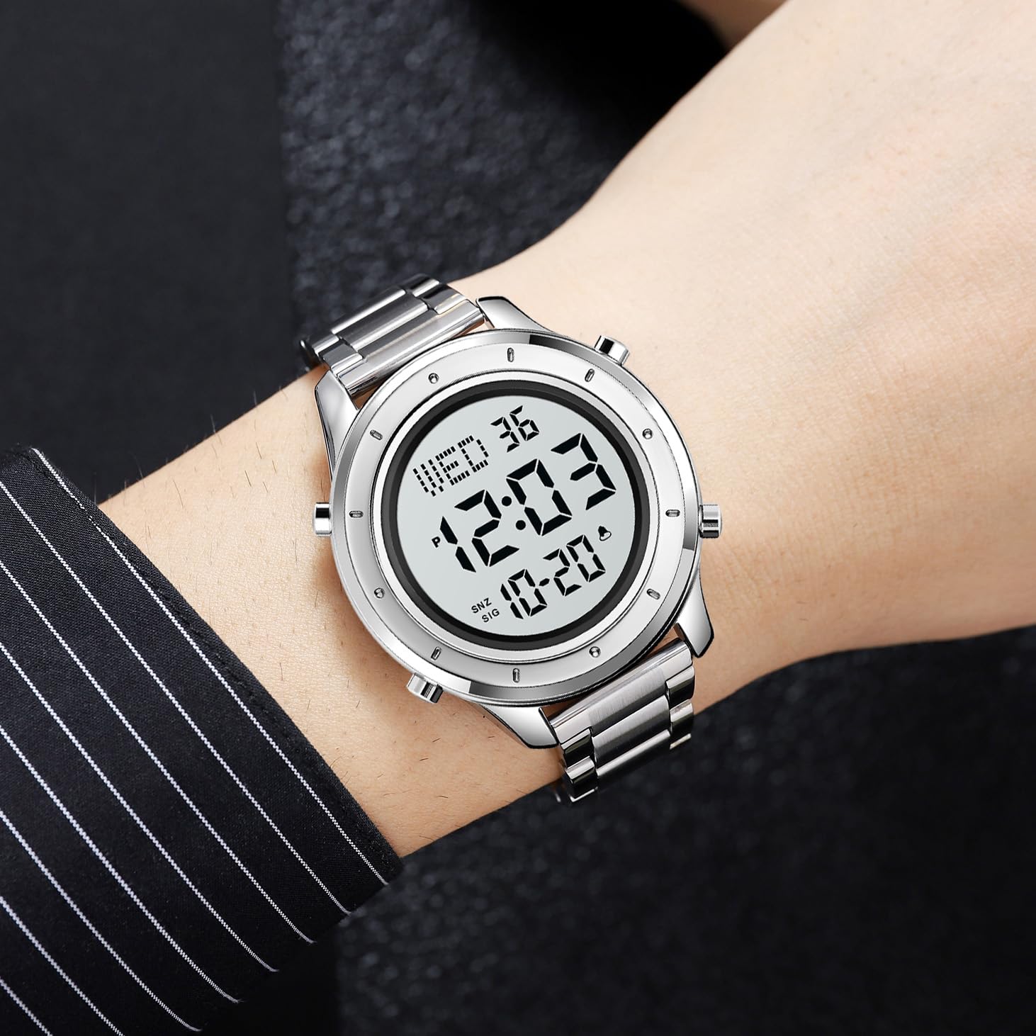 【Nice Large Digits】This ZOLOHONI stainless steel digital watch is very masculine and keeps excellent time. It is very easy to see the numbers indoors and specially outdoors, even at night, light illuminates well. VERY LARGE digital face and big numbers readout is convenient for reading.