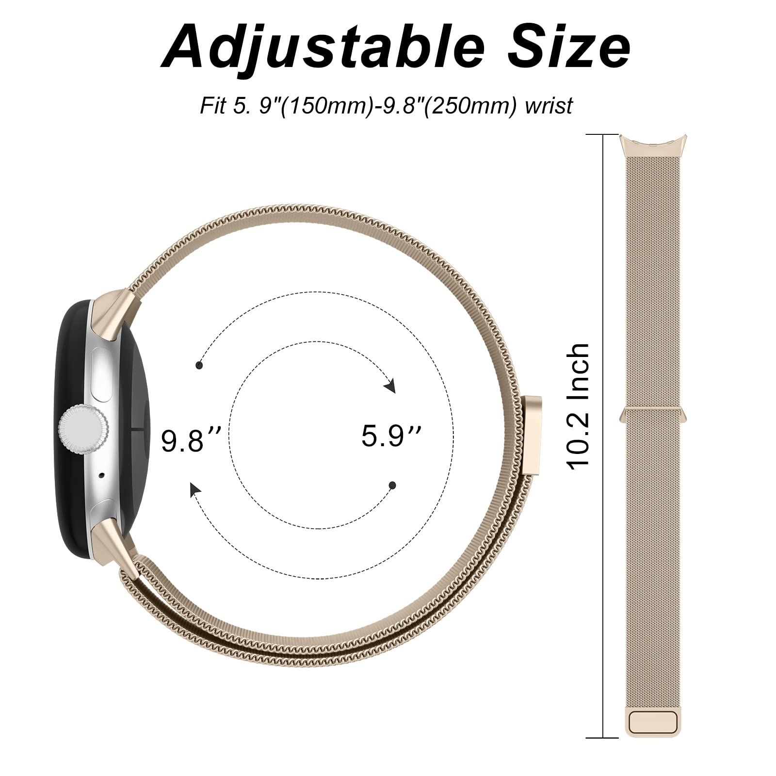 Description Metal Band Compatible with Google Pixel Watch Bands for Women Men, Stainless Steel Mesh Loop Adjustable Wristband Replacement Strap for Google Pixel Watch / Pixel Watch 2 Compatibility: -Google Pixel Watch 2022 -Google Pixel Watch 2 2023 -Google Pixel Watch 3 41mm 2024 Note: Please check your watch model before buy it. Size: 5.9inch-8.6inch (150mm-220mm) fits for most men's and women's wrist size. Packaging: 1x Metal Watch Band for Google Pixel Watch / Pixel Watch 2/ Pixel Watch 3 41mm Features: *Multiple unique and bright colors to choose from,it can matches your style and highlight your personality. *With design of magnet buckle,just easily stick to lock your watch band,very easy to adjust the length of the strap. *Made of high-quality stainless steel material,flexible,comfortable, lightweight,breathable,and skin-friendly. *Combining fashion,classic,durability and elegance.The classic and stylish sport style makes your Pixel Watch 1 / 2 look more fashionable and sexual,very easy to match your daily clothing. -Gift Choice:Perfect for a great gift choice for Wedding, Birthday, Valentines' day, Mothers' day, Christmas, Thanksgiving Day etc. 12 Months Warranty: Unconditionally refund or free replace if defective or any quality problems.We provide 24/7/365 kindly service.Please feel free to email us if you met any problem in using our Replacement bands.