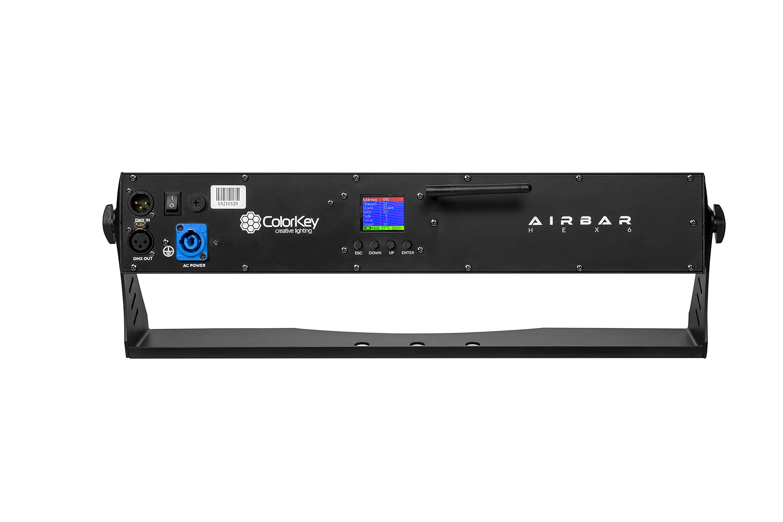The ColorKey AirBar HEX 6 is a battery-powered wireless LED bar designed to help you effortlessly illuminate your events. It offers a powerful 72 watts of RGBAW-UV color mixing for an endless range of smooth, bright colors. Its long-lasting Lithium-Ion battery can run for up to 20-hours on a single color, or up to 6-hours running all colors. A full charge takes about 5-hours.AirBar HEX 6 features a host of control options. The fixture itself has a built-in transceiver, which means you can control all other fixtures in the chain while in Master/Slave mode. Use the vivid OLED menu display or the included IR remote. Both provide instant access to preset programs, color mixing and on-the-fly speed adjustments for the full range of Air Series fixtures. The AirBar HEX 6 features 3-pin DMX ports to connect to DMX controllers and is also suitable for installs or events where DMX and power-chaining are required.For even greater control, add the ColorKey AirHub DMX to your setup. The AirHub is a battery-powered Wi-DMX transceiver, and the central control hub of the Air Series ecosystem. The AirHub can generate a WIFI network for use with an optional app for iPhone and iPad. The AirApp is a basic DMX controller in your pocket. It offers access to all the presets found on the AirHub, plus a color wheel with dimmer and 16 DMX channel faders.The built-in mounting bracket makes for easy positioning from the floor or when hung with clamps.The ColorKey AirBar HEX 6 is bound to become your go to fixture for wall washes or lighting up DJ facades, thanks to its flexibility and ease of use.Features Wireless LED bar with rechargeable battery and 2.4GHz transceiver 6 x 12-Watt RGBAW-UV LED’s for bright even colors Included IRC-6 wireless remote for simple non-DMX control Built-in lithium-ion battery provides up to 20 hours of life on a 5hr charge Large multicolor OLED menu display for easy access to fixture settings Works with optional AirApp for iPhone and iPad (requires ColorKey AirHub DMX for WIFI connection) Adjustable kickstand shines light where you need it DMX and power chaining for permanent installsSpecifications 6x12W RGBWA+UV 6-in-1 LEDs 25˚ beam angle DMX Channel Modes: 3 / 6 / 8 / 11 channels Built-in 2.4Ghz Wi-DMX transceiver for wireless connectivity Lithium-Ion battery (+/-) 20 hours single color; (+/-) 6 hours full color, (+/-) 5 hours charge time Control modes: Wi-DMX, DMX 512, IR Remote, Master /Slave, Sound Active, Stand Alone, AirApp for iPhone and iPad* Multicolor OLED display for easy access to fixture settings 0-100% Dimmer 3-pin DMX In/Out connectors PowerCon in and out connectors Lamp rated life: >50000 Hours Flicker Free Working temperature: up to 40˚C Power consumption: 48W Power supply: AC100-240V;50-60Hz Product size: 5.4 x 5.6 x 7.4 in Net Weight: 6.1lbs