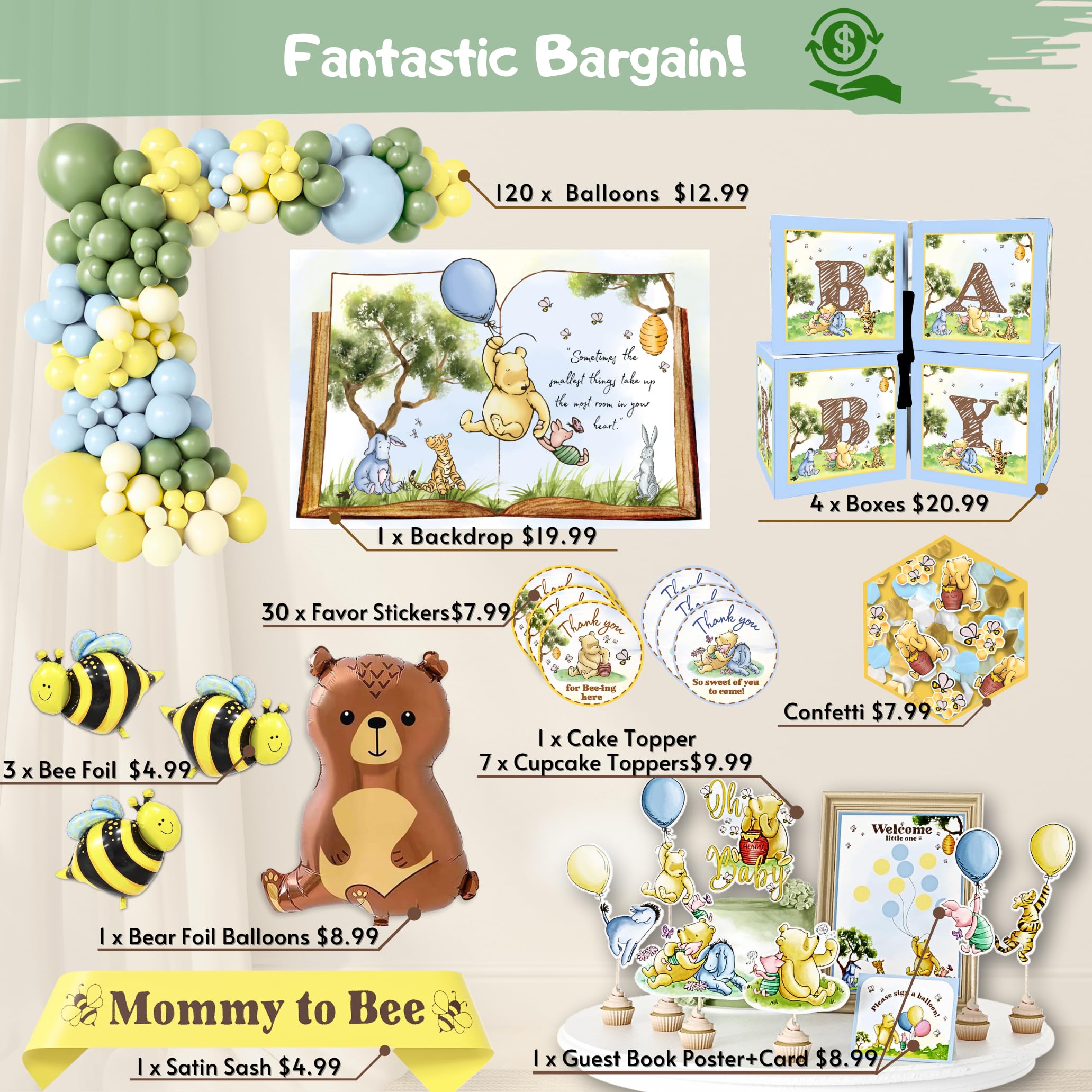 269 pieces including cake and cupcake toppers, guestbook poster, confetti, Mommy-to-Bee satin sash, latex and foil balloons, balloon boxes, favor stickers, and accessories