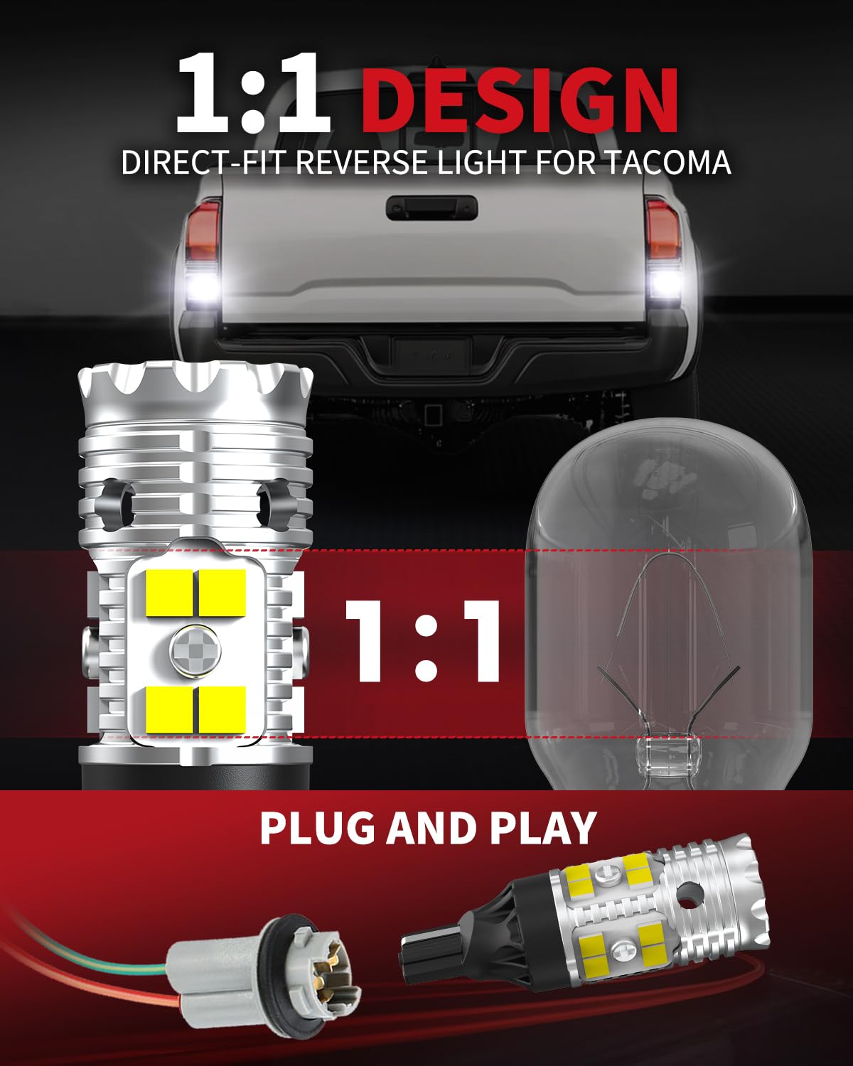 Easy Installation, Plug & Play: With a 1:1 halogen bulb design and non-polarity feature, this 921 LED reverse light directly fits into the Tacoma's standard sockets. Simply plug it in—no wiring modifications required. Even beginners can complete the installation in minutes. If the 921 LED bulb doesn't light up, simply remove, flip, and reinstall