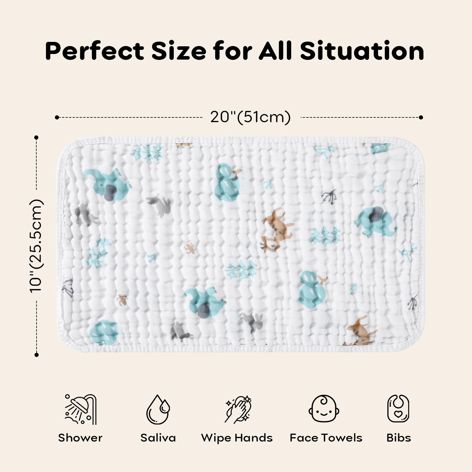 MULTI-FUNCTION - 20x10 inches, our muslin washcloths will be your favorite daily essentials as reusable baby wipes, burp cloths, baby face towels, cloth diapers, body washcloths, adult face towels and anything else that's available. Perfect 6pcs meet your baby's different need.