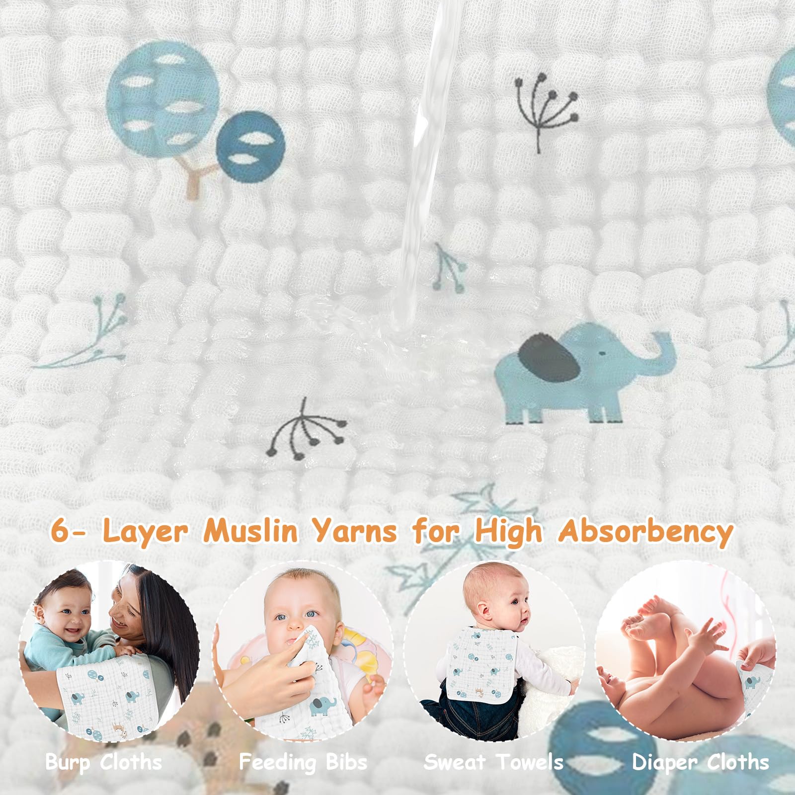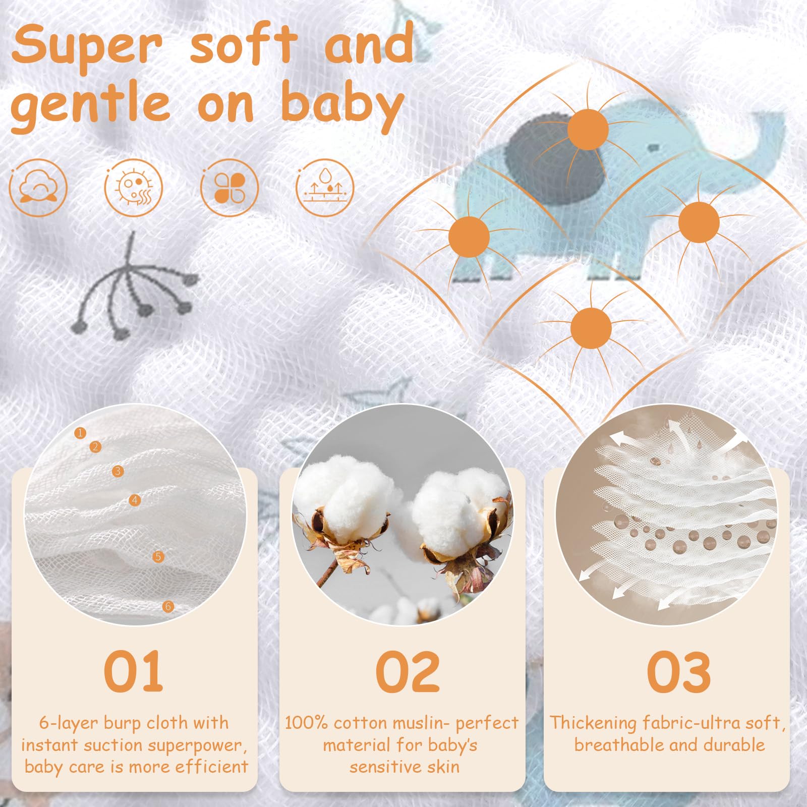 EXCELLENT ABSORBENCY - With 6-Layer thickening design fabric, these face cloths provide premium softness, breathability and durability. Soft material features its super liquid-absorbing and quick-drying nature, giving baby's skin perfect care.
