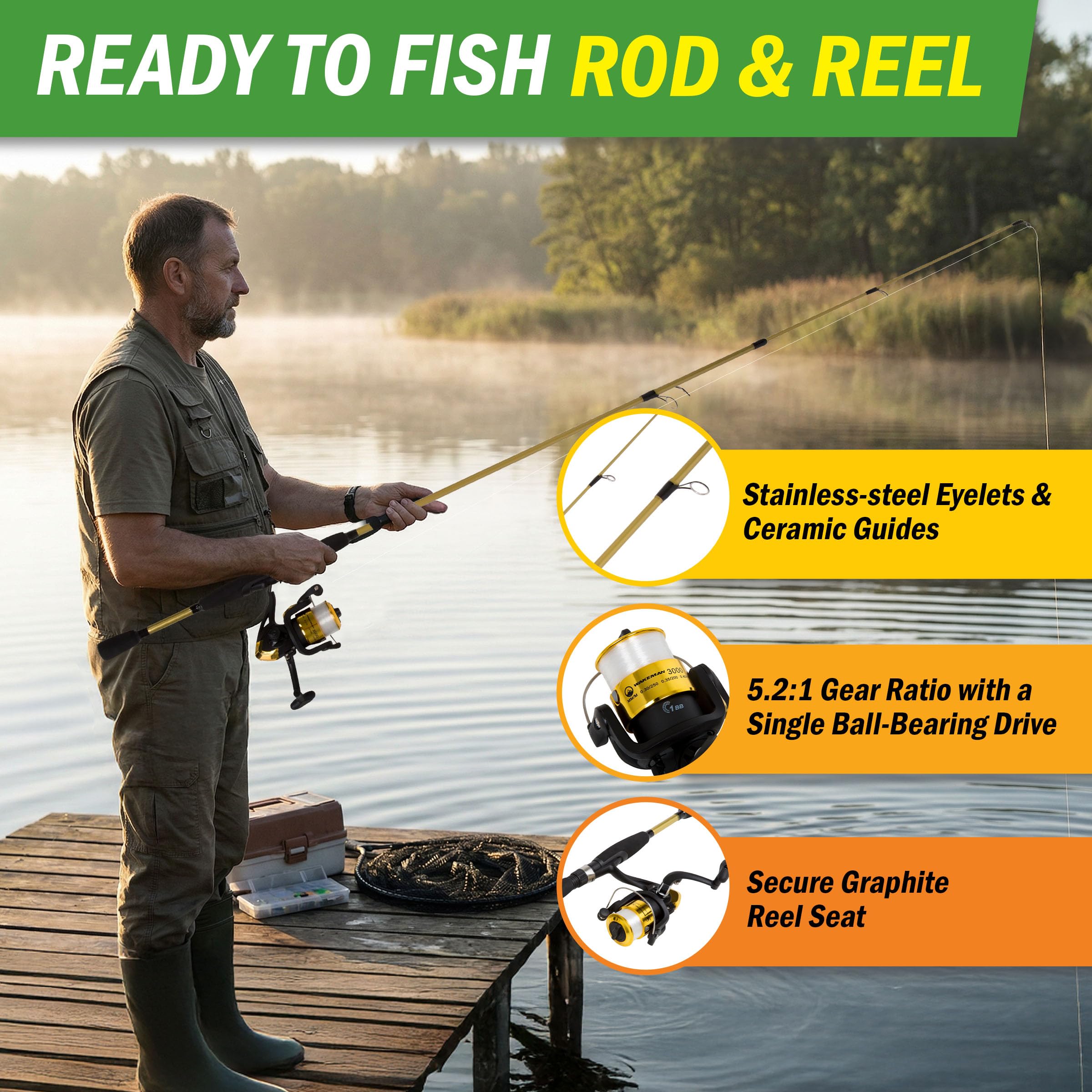 The versatile medium action Fiberglass Fishing Rod and Reel Combo by Wakeman is great for fishing from the shoreline or while trolling in a bay. The 78-inch fishing pole is outfitted with a split EVA foam handle, stainless-steel eyelets, ceramic guides, a graphite reel seat, and a 5.2:1 ratio size 30 open style spinning reel spooled with 250 yards of 6lb monofilament line for extended casting. This catfish rod and reel combo collapses into 2 sections for travel on your next outdoor adventure. IMPORTANT: Wakeman committed to providing the consumer with the absolute best price and value on all of our products. NOTE: This is an exclusive product of Wakeman and ONLY Fishing Rods by Wakeman are GUARANTEED to be genuine. Avoid buying counterfeit products and transacting with unauthorized sellers. Wakeman a registered trademark protected by U.S. Trademark law and will be vigorously defended.