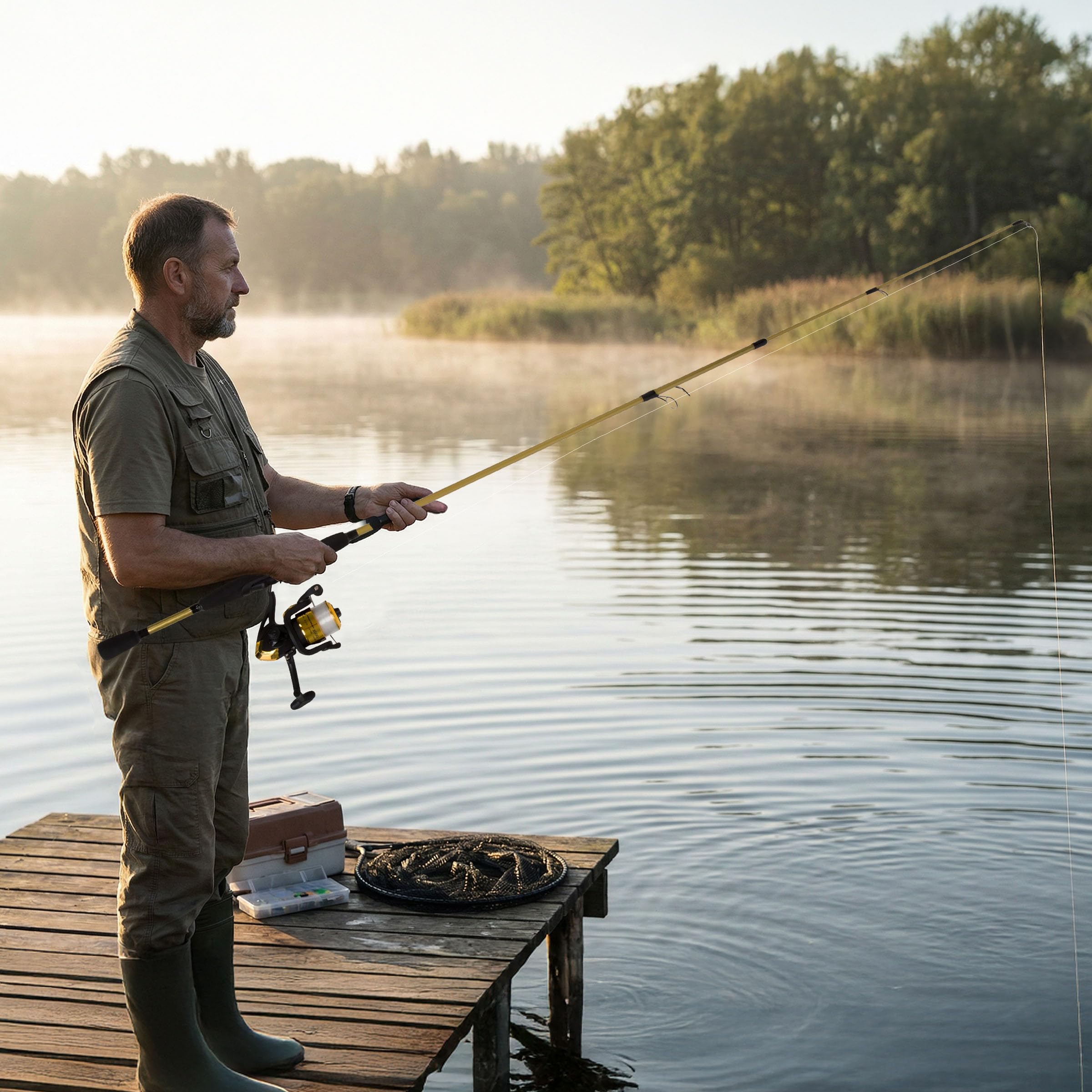 PRODUCT DETAILS – Materials: Fiberglass, Aluminum, Stainless-Steel, Ceramic, Graphite, and EVA Foam. Dimensions: (L) 78” x (W) 5.75” x (H) 5”. Comes with Pre-spooled with 250-yards of 6lb Monofilament Line. Color: Gold Metallic Finish.