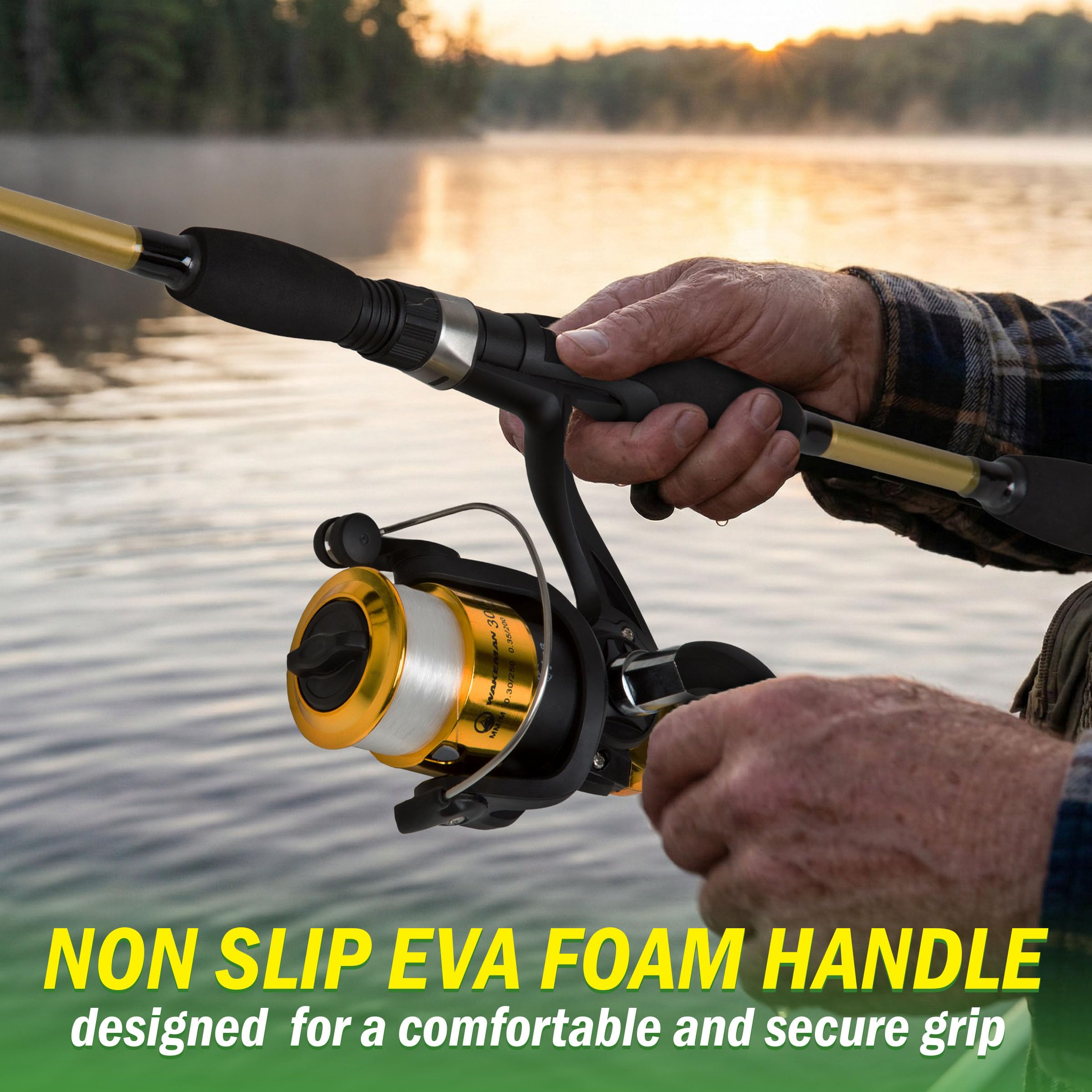 BASS FISHING ROD – The 78-inch-long medium action fiberglass bass fishing pole features a split EVA foam handle for a secure grip and collapses into 2 parts for easy storing. The rod and reel combo are ideal for fishing walleye, pike, catfish, and more.