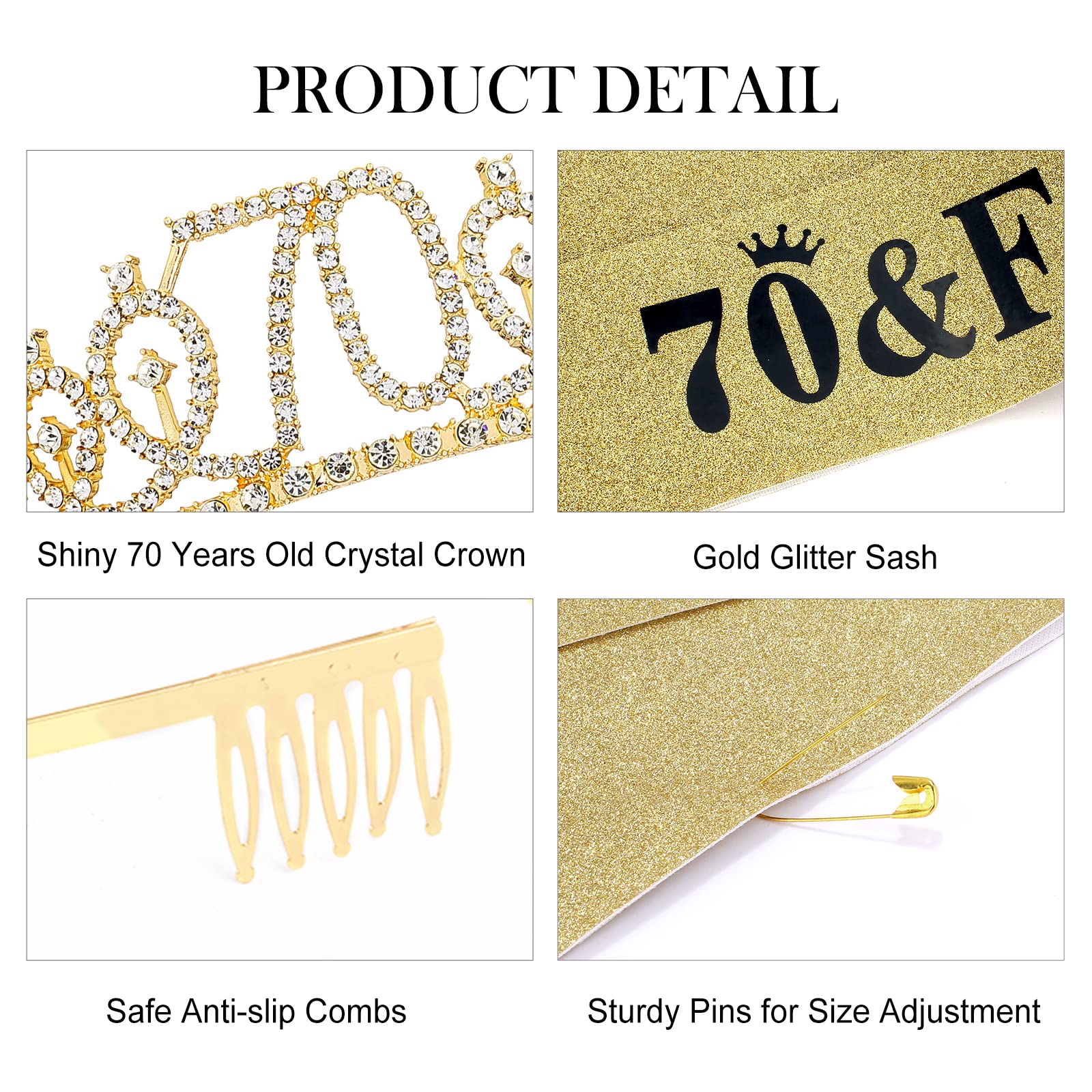 ♕[Package contents]:1 pcs 70th birthday rhinestone tiara , 1 pcs “70 & Fabulous” birthday sash and 1 pcs pin.Crown and sash color are both gold.Gold is gorgeous and pretty delicate.