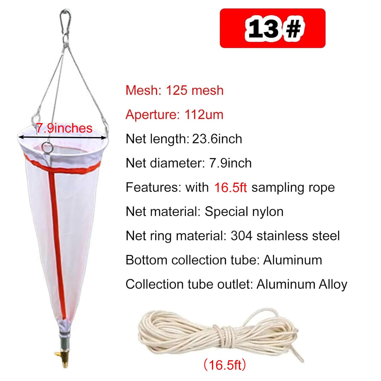 Description: -- Plankton play a key role in aquatic ecosystems and are essential for ecological balance and scientific research. -- Our Plankton Net is a good helper for you to explore the microscopic aquatic world. Specifications: -- 13# Mesh: 125 mesh -- 13# Aperture: 112 μm -- 25# Mesh: 200 mesh -- 25# Aperture: 64 μm -- Net length: 23.6 inch -- Net diameter: 7.9 inch -- Net material: special nylon -- Net ring material: 304 stainless steel -- Bottom collection tube: Aluminum Features: -- Metal mesh ring supports the mesh body, anti-rust and corrosion resistance, to ensure the continuous opening in the water. -- Nylon material is specially woven to resist the impact of water flow and stabilize the mesh in long-term use. stment. -- The 16.5 ft long sampling rope is not easy to tangle. -- 23.6 inches length, 7.9 inches opening diameter, optimized for collection volume and easy operation. -- The ergonomic grip is non-slip and easy to operate. -- 25# net with 64μm pore size and 13# net with 112μm pore size are suitable for collecting different sizes of zooplankton. How to choose? -- Use 25# for collecting phytoplankton, protozoa and rotifers -- Use 13# for collecting cladoceras, copepoda and other zooplankton Package Includes: -- 1 × Plankton Net with 250ML Transparent Bottle Note: -- Select different models of small plankton nets according to different collection requirements. -- After sampling, clean and dry the plankton net and store it in a cool and dry place
