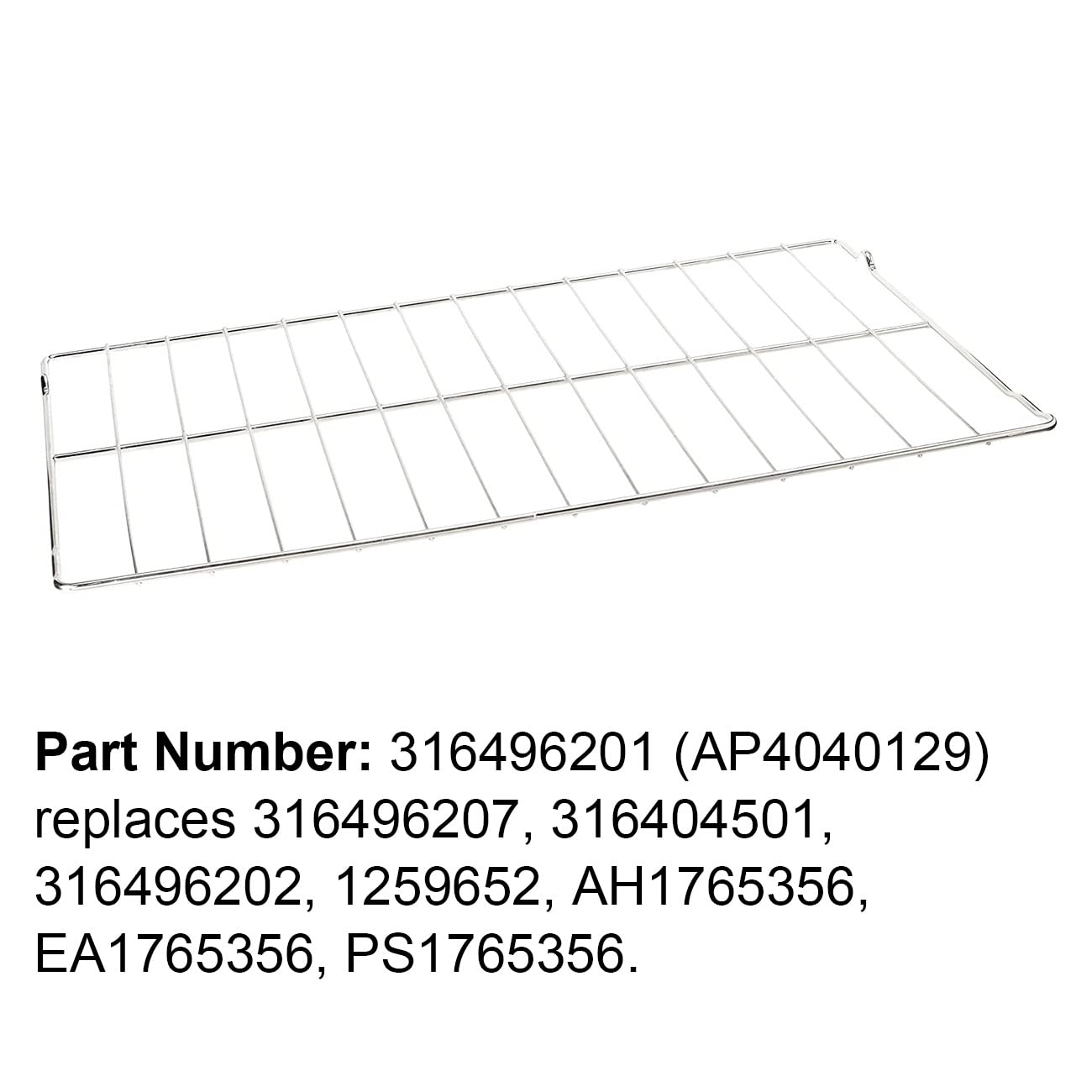 316496201 Range Oven Rack is 16 inches by 24.25 inches, replaces part numbers 316404501, 316496202, 316496207, 316404501, 1259652, AP4040129, AH1765356, EA1765356, PS1765356, please confirm before purchasing. Some Compatible Range Models: FGEX26D6QF0, FFHS2622MB0, FFHS2622MB1, FFHS2622MB2, FFHS2622MB3, FFHS2622MB4, FFHS2622MB5, FFHS2622MB7, FFHS2622MB8, FFHS2622MB9, FFHS2622MBA, FFHS2622MBB, FFHS2622MBC, FFHS2622MBD, FFHS2622MBE, FFHS2622MBF, FFHS2622MBG, FFHS2622MBH, FFHS2622MBJ, FFHS2622MBL, FFHS2622MBMA, FFHS2622MBPA, FFHS2622MBQA, FFHS2622MH0, FFHS2622MH1, FFHS2622MH2, FFHS2622MH3, FFHS2622MH5, FFHS2622MH6, FFHS2622MH8, FFHS2622MH9, FFHS2622MHA, FFHS2622MHB, FFHS2622MHE, FFHS2622MHF, FFHS2622MHH, FFHS2622MM0, FFHS2622MM1, FFHS2622MM2, FFHS2622MM3, FFHS2622MM5, FFHS2622MM6, FFHS2622MM7, FFHS2622MM8, FFHS2622MM9, FFHS2622MMA, FFHS2622MMB, FFHS2622MMD, FFHS2622MME, FFHS2622MMF, FFHS2622MMH, FFHS2622MQ0, FFHS2622MQ1, FFHS2622MQ2, FFHS2622MQ3, FFHS2622MQ5, FFHS2622MQ9, FFHS2622MQA, FFHS2622MQB, FFHS2622MQC, FFHS2622MQD, FFHS2622MQF, FFHS2622MQG, FFHS2622MQJ, FFHS2622MS0, FFHS2622MS1, FFHS2622MS2, FFHS2622MS3, FFHS2622MS4, FFHS2622MS5, FFHS2622MS7, FFHS2622MS8, FFHS2622MS9, FFHS2622MSA, FFHS2622MSB, FFHS2622MSC, FFHS2622MSE, FFHS2622MSF, FFHS2622MSG, FFHS2622MSH, FFHS2622MSJ, FFHS2622MSL, FFHS2622MSM, FFHS2622MSN, FFHS2622MSP, FFHS2622MSR, FFHS2622MSS, FFHS2622MSVA, FFHS2622MSWA, FFHS2622MSXA, FFHS2622MSYA, FFHS2622MW0, FFHS2622MW1, FFHS2622MW2, FFHS2622MW3, FFHS2622MW4, FFHS2622MW5, FFHS2622MW7, FFHS2622MW8, FFHS2622MWA, FFHS2622MWB