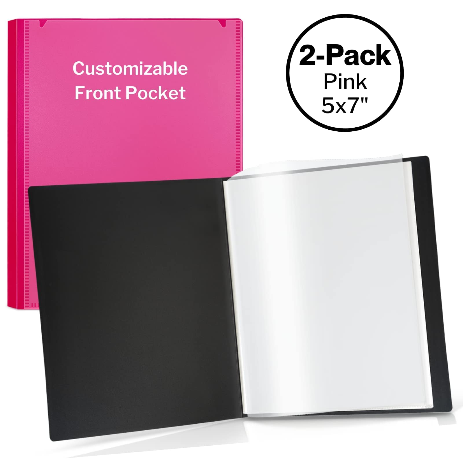 Customizable cover: Insert a photo in the front pocket to create your own theme binder. Set of two 5 by 7 photo albums constructed of sturdy poly plastic. Attractive pink cover with black interior.