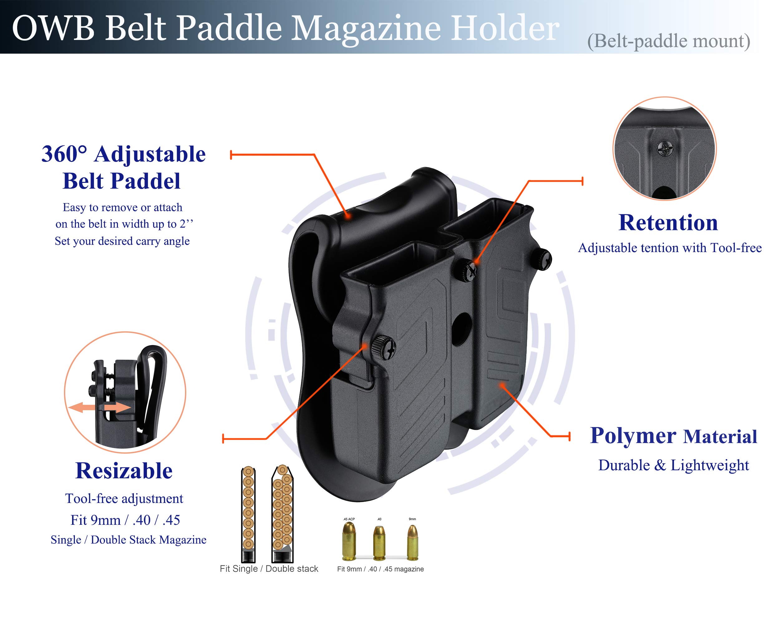 Durability: Our OWB Mag holster is constructed of injection molded polymer for long-lasting durability. It's resistant to impact, heat and scratch, designed for tactical training, hunting, military, the range, law enforcement agencies, personal defense, daily carry and open carry of any kind.