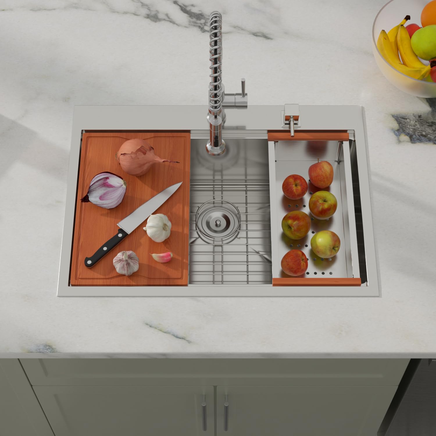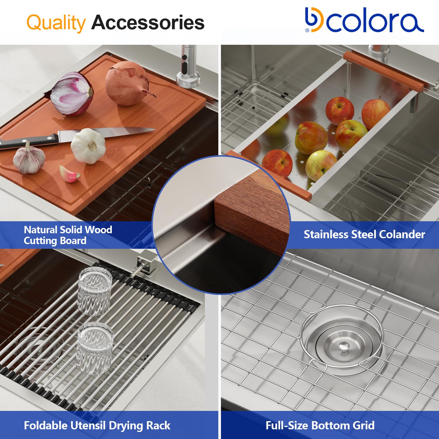 Flexible workstatio: With the help of the lips on the front and rear of the sink, the sink can be converted into a working space. With Dcolora accessories including cutting boards, drying racks, drain pans, bottom grids, kitchen work can work easier.