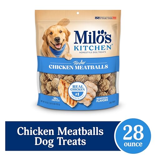 Contains one (1) 28-oz. bag of Milo’s Kitchen Chicken Meatballs dog treats