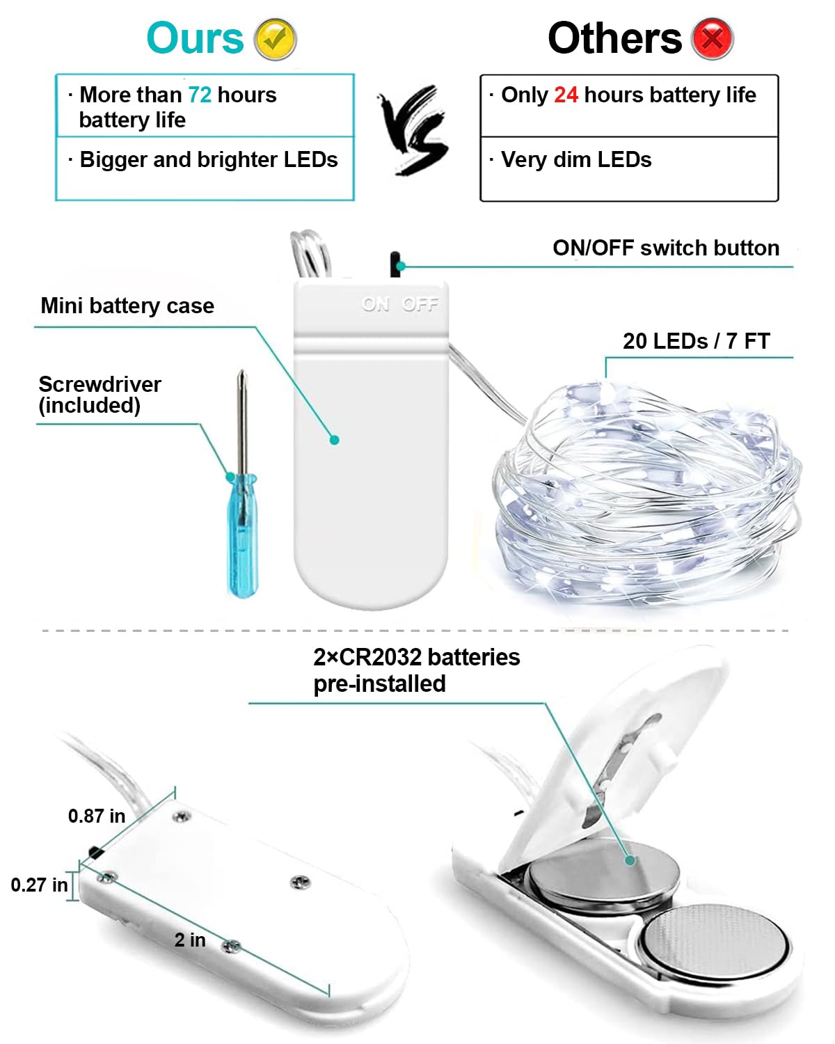 HOBAYS 12 Pack Fairy Lights Battery Operated, 7ft 20 LED Mini String Lights The small LED fairy lights powered by CR2032 batteries will be more convenient to carry and make your party decoration more convenient. The mini battery box can be more conveniently hidden in the work, so these mini fairy lights are more suitable for birthday parties, Christmas, weddings, bedrooms, backyard and gift decoration. Higher quality standards - The copper wire part is waterproof, weatherproof and windproof, easy to use, very bright, and always provides a lovely and relaxing environment. Flexible copper wire - The fairy string lights is made of a flexible thin copper wire. It can be easily bent and flexibly molded into any shape you want. Safety and energy saving - LED starry lights has low energy consumption. No overheating, safe to touch. No glare, soft and warm light to protect your eyes. Specifications LED Color: Cool White LED Quantity: 20 LEDs Length between LEDs: 4 inch String Length: 7ft Waterproof: IP65 Wire Color: Silver Package 12 * LED Fairy Lights 1 * Screw driver