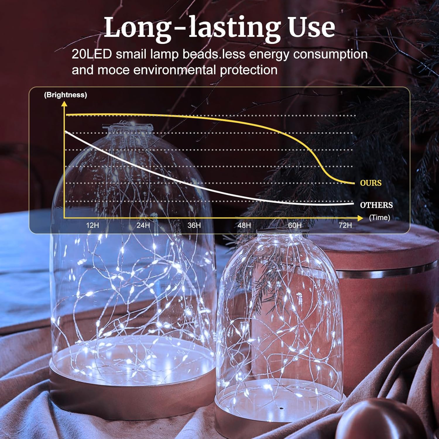 【Durable Material and Safe To Touch】 We insist on using high-quality materials for each of our mini string lights, since providing high-quality products to customers is the principle of our brand. Our Silver plated copper wire mini lights using high quality 3V low voltage insulated line, which makes it cool to touch and safe to use, the soft LED lights will not harm children’s eyes.