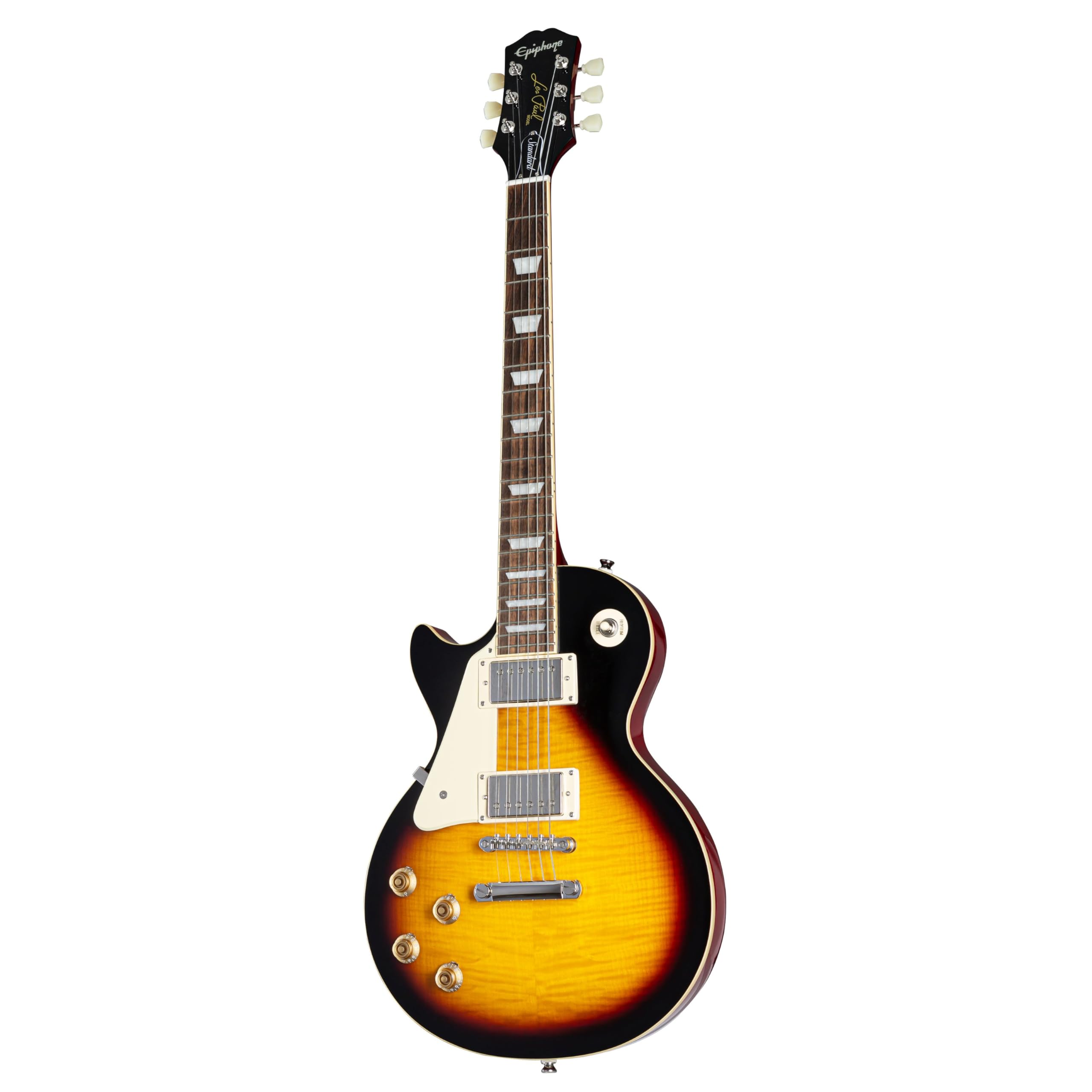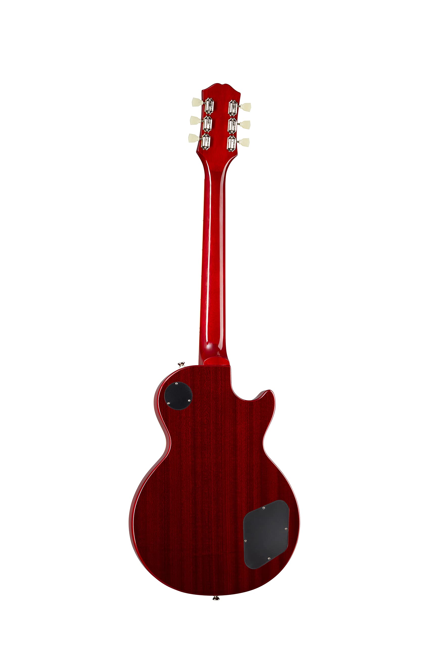The Epiphone Les Paul Standard 50s is crafted with a mahogany body, maple cap (AAA veneer on figured tops), bound 50s shaped mahogany neck with long neck tenon, Indian laurel fingerboard with classic trapezoid inlays, Epiphone's new Vintage Deluxe tuners, a pair of critically acclaimed Epiphone ProBucker humbuckers, and gold Top Hat knobs with dial pointers.