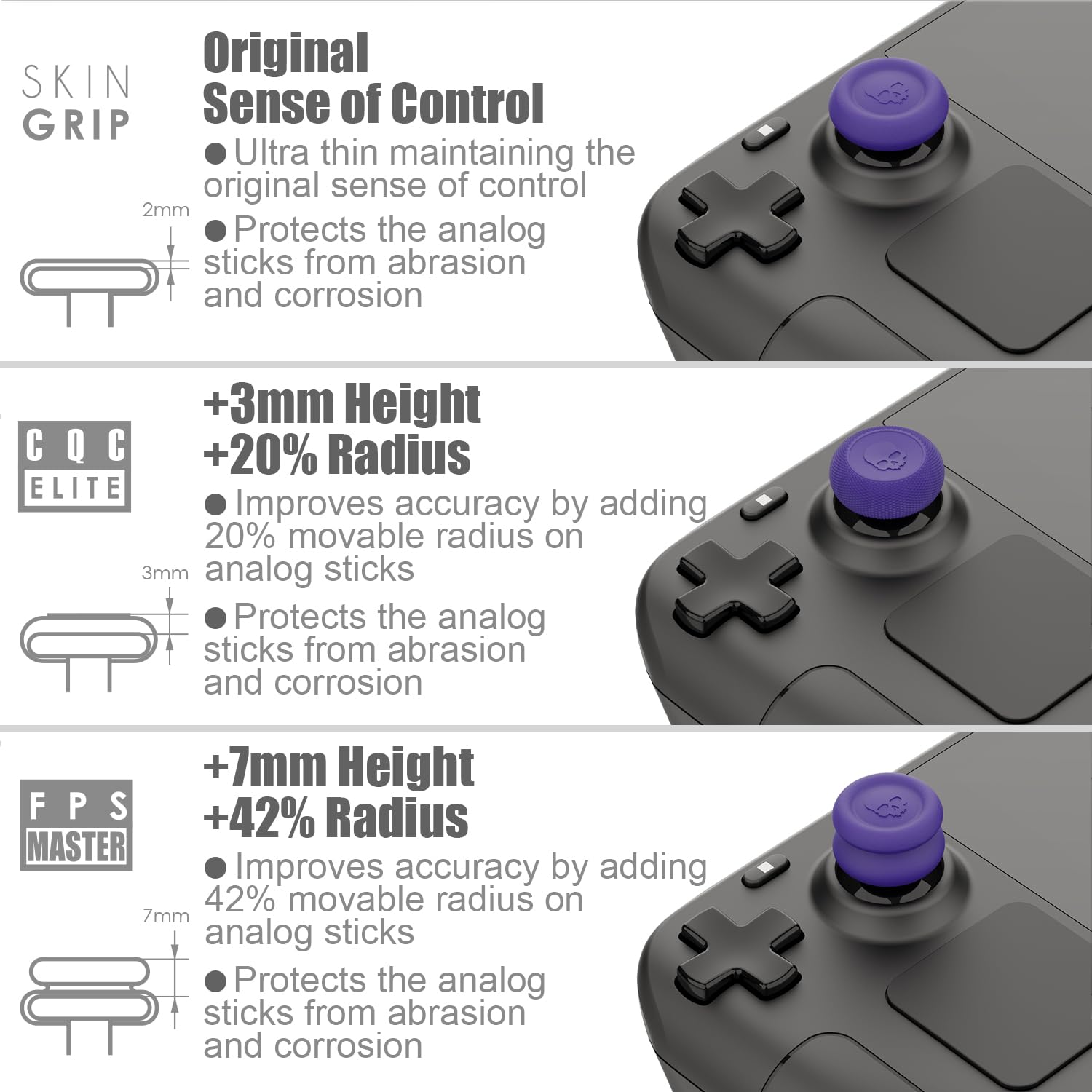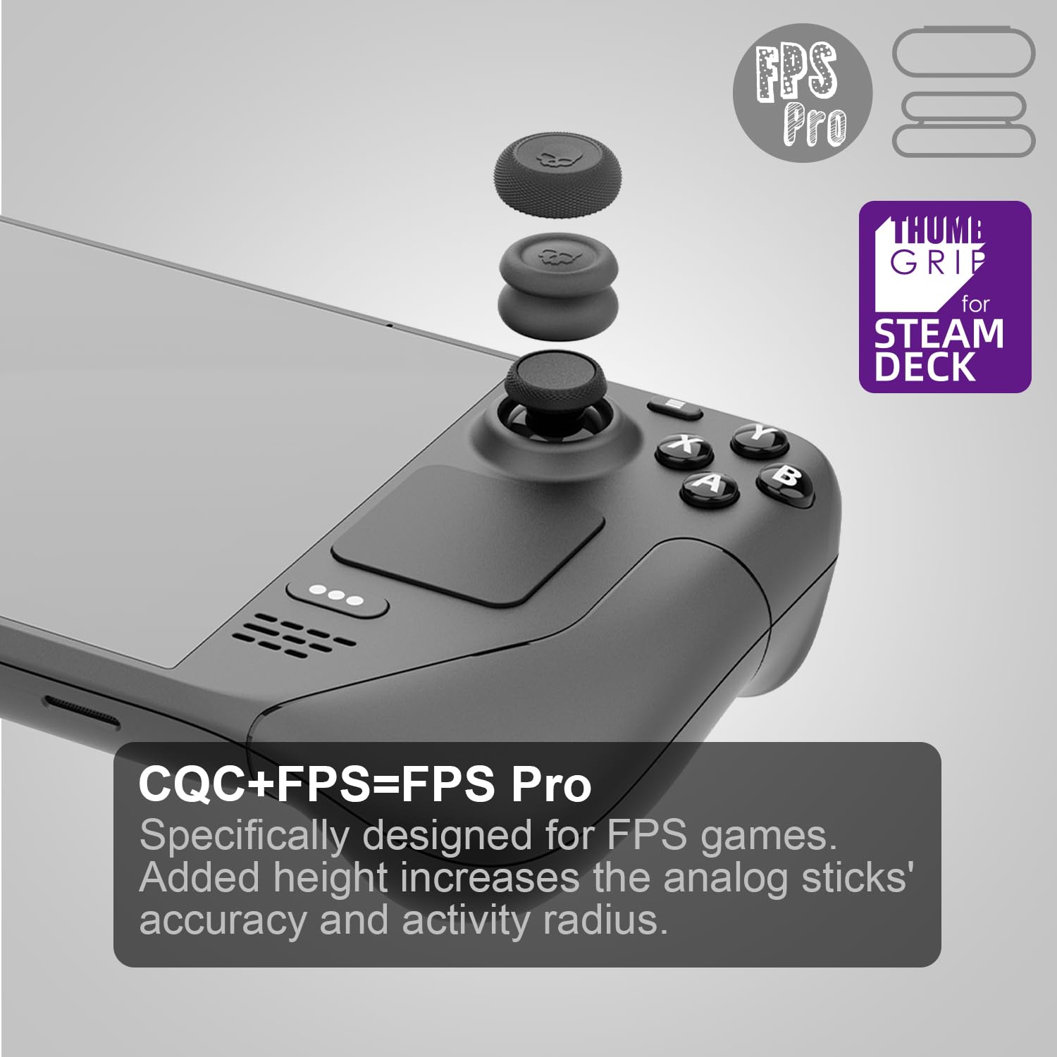 Specification: Compatible with: Steam Deck, ROG Ally, Ally X Package Includes: 1x Pair Skin Grip Thumb Grip 1x Pair CQC Elite Thumb Grip 1x Pair FPS Master Thumb Grip Important Reminder: The Thumb Grip Set is non-capacitive. Note: When you find thumb grips become greasy, please remove them and clean them with detergent.