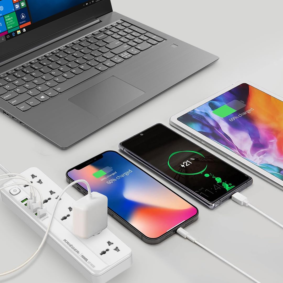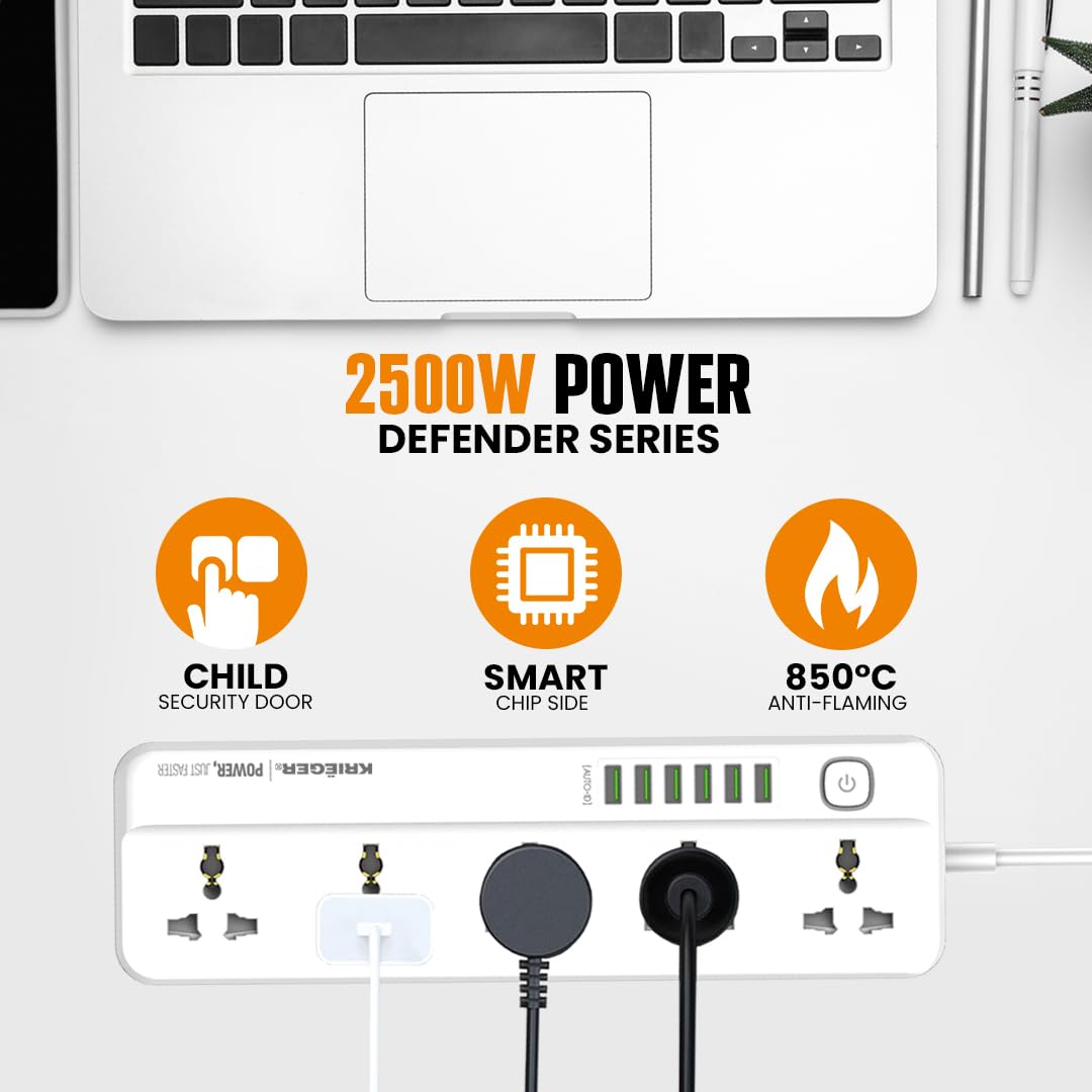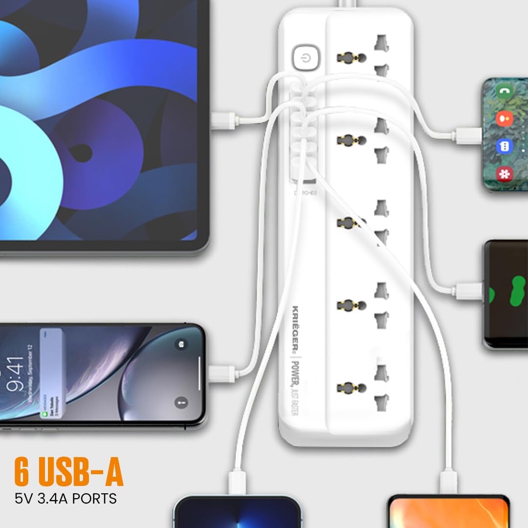 5 Universal AC outlets, 6 usb ports, 2m in Length and 2500W of power. You can charge your cellphone, tablet, laptop and game consoles simultaneously.