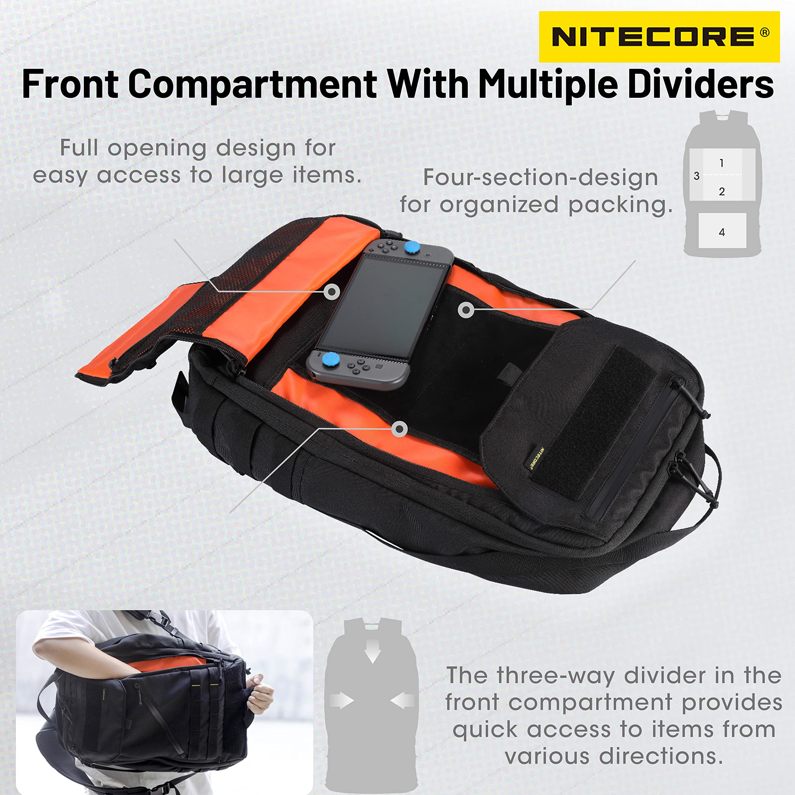 Besides, the front compartment features a full opening design with 4 sections, which is convenient for the access of large items. The special three-way divider provides quick access to items from various directions.