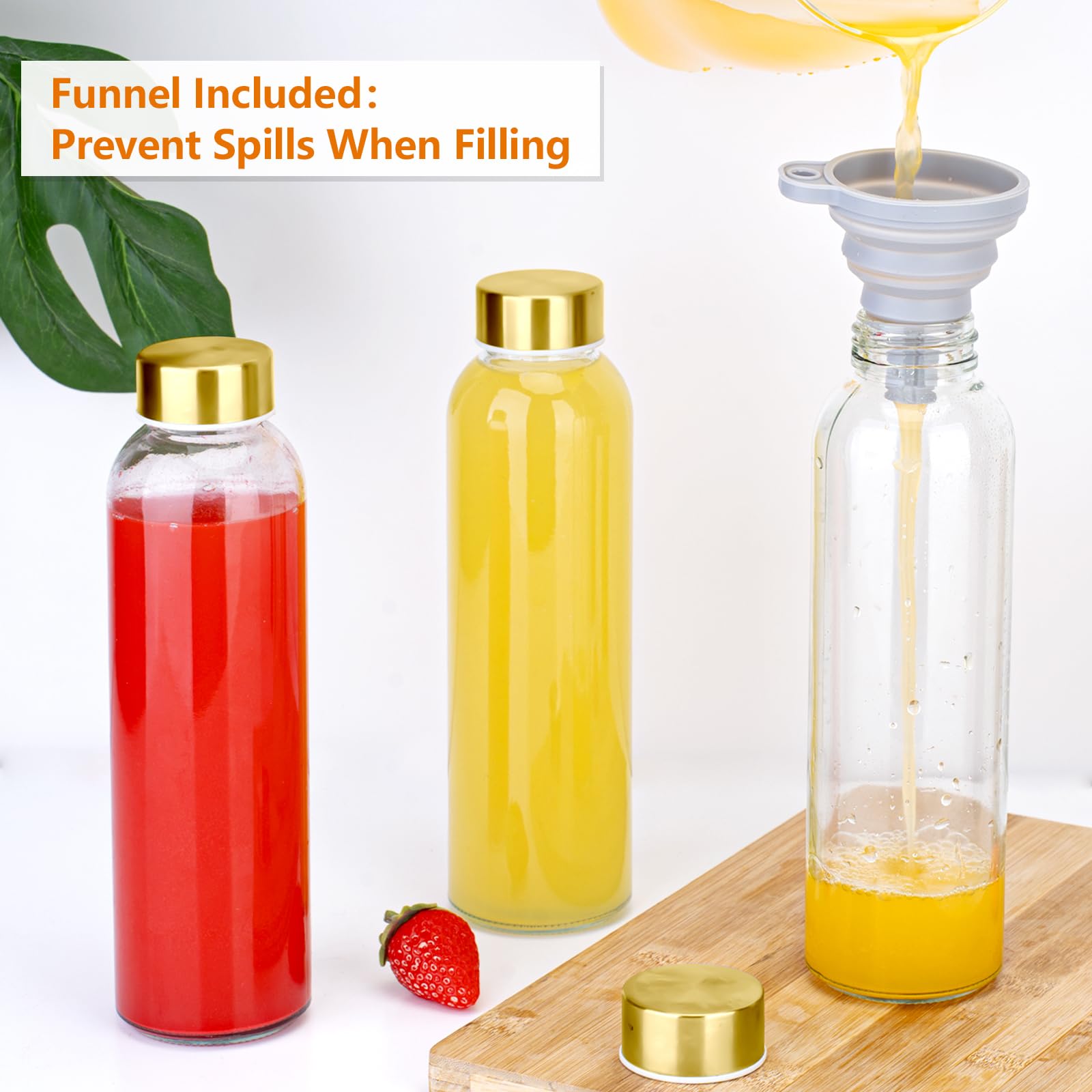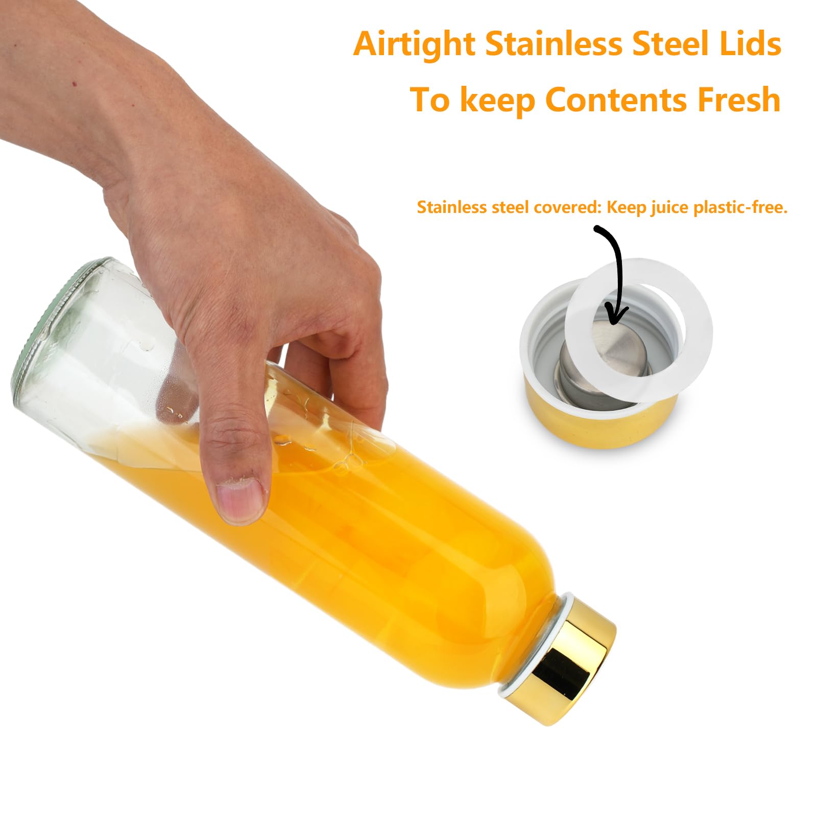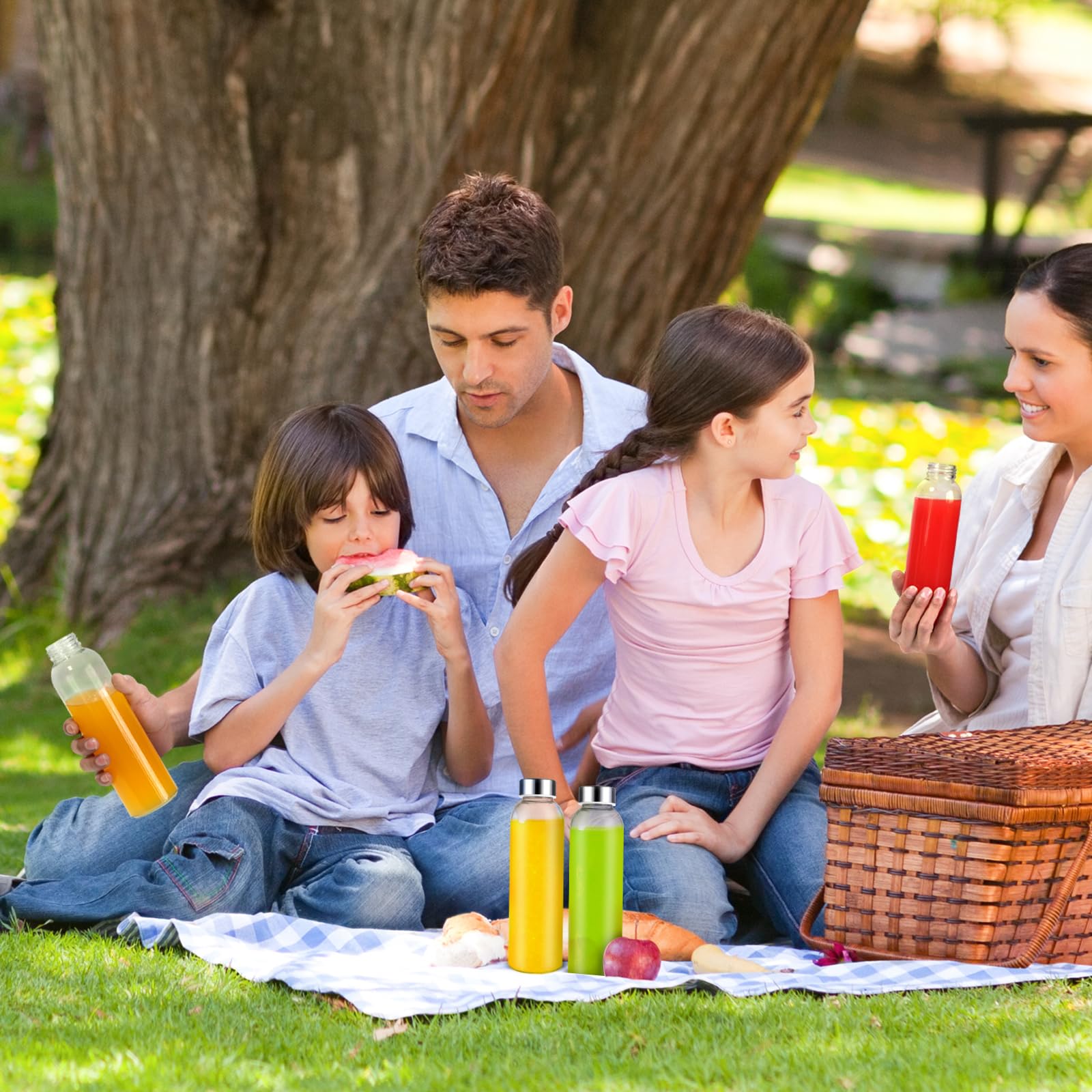 GLASS BOTTLES FOR JUICING AND MORE: Durable stainless steel lids with air and water-tight seals, so it's completely airtight to keep your beverage fresh without spills. Throw this glass water bottle in your bag and get a healthy start to your day with a juice, smoothie, brew, ice tea, iced coffee, nut milk, Kombucha or water. The 100% leak proof glass bottle will never leave a leaky mess no matter how you place it. The clear glass helps you quickly spot the drink you're in the mood for.