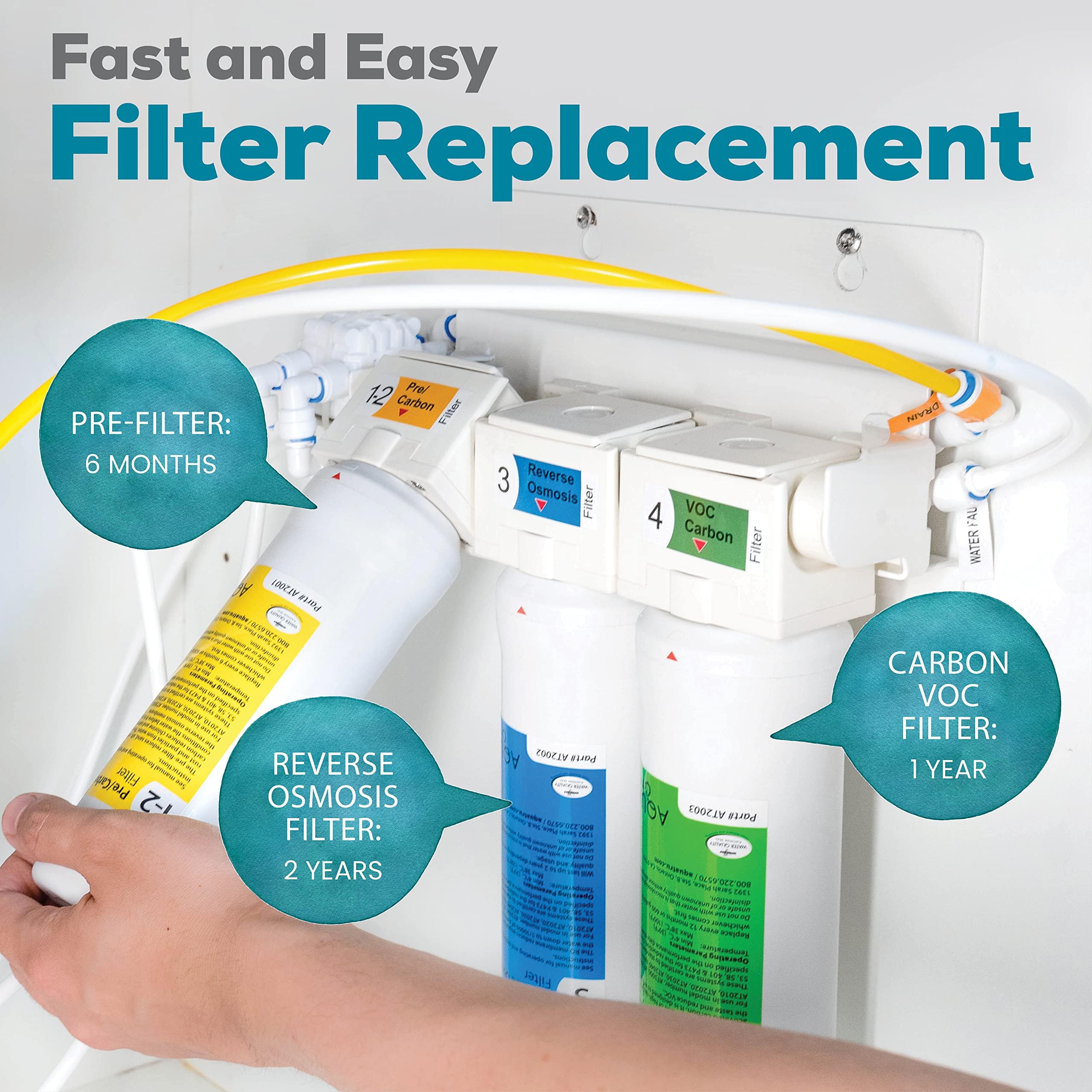 Premium Long-Lasting, Easy-To-Change Filters - AquaTru’s affordable filters are made to last for 360-1200 gallons – that’s a filter change every 6 mos. to 2 yrs. AquaTru Under Sink Reverse Osmosis Water Purifier uses the same water filters as the AquaTru Countertop Purifiers (not including the Carafe)