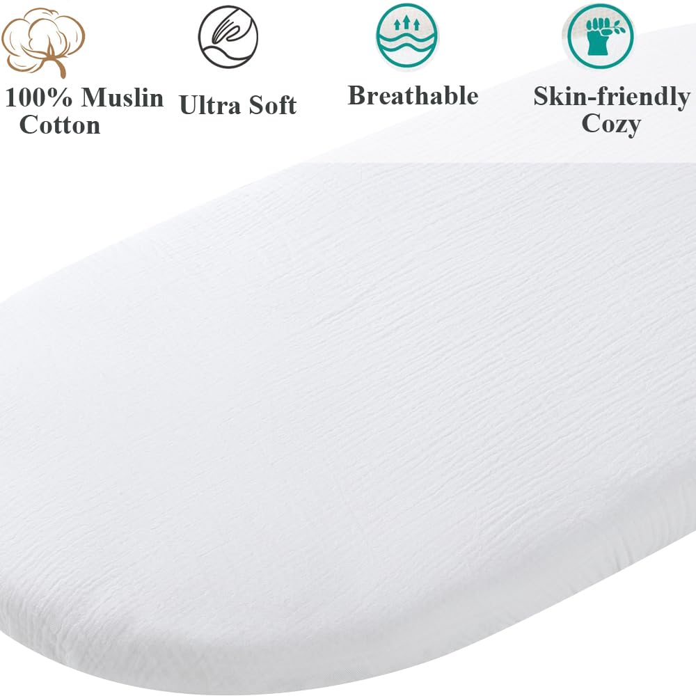 Ultra soft,breathable,skin-friendly: Our bassinet sheet is made of extremely soft 100% muslin cotton material. super soft, breathable,skin friendly, keep your little one warm and cozy in cooler weather, let their skin breathe in warmer weather,ideal for baby’s delicate skin.