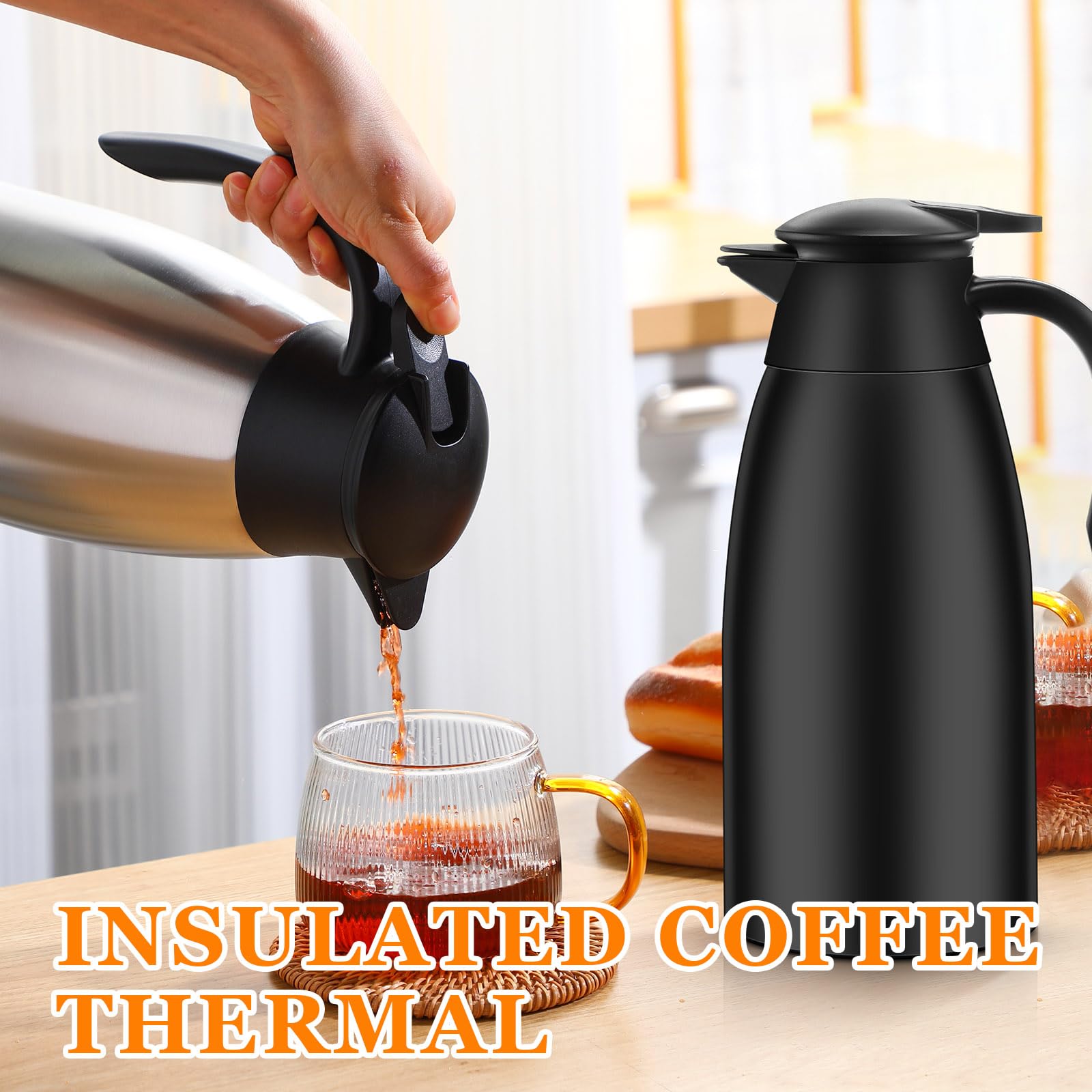 Proper Capacity: the vacuum insulated thermal coffee carafe measures about 68 oz in capacity, ideal size for holding tea, coffee, milk, water, juices, lemonade, and other cold or hot drinks; With a nonslip silicone base, it can keep stable on your table or countertop
