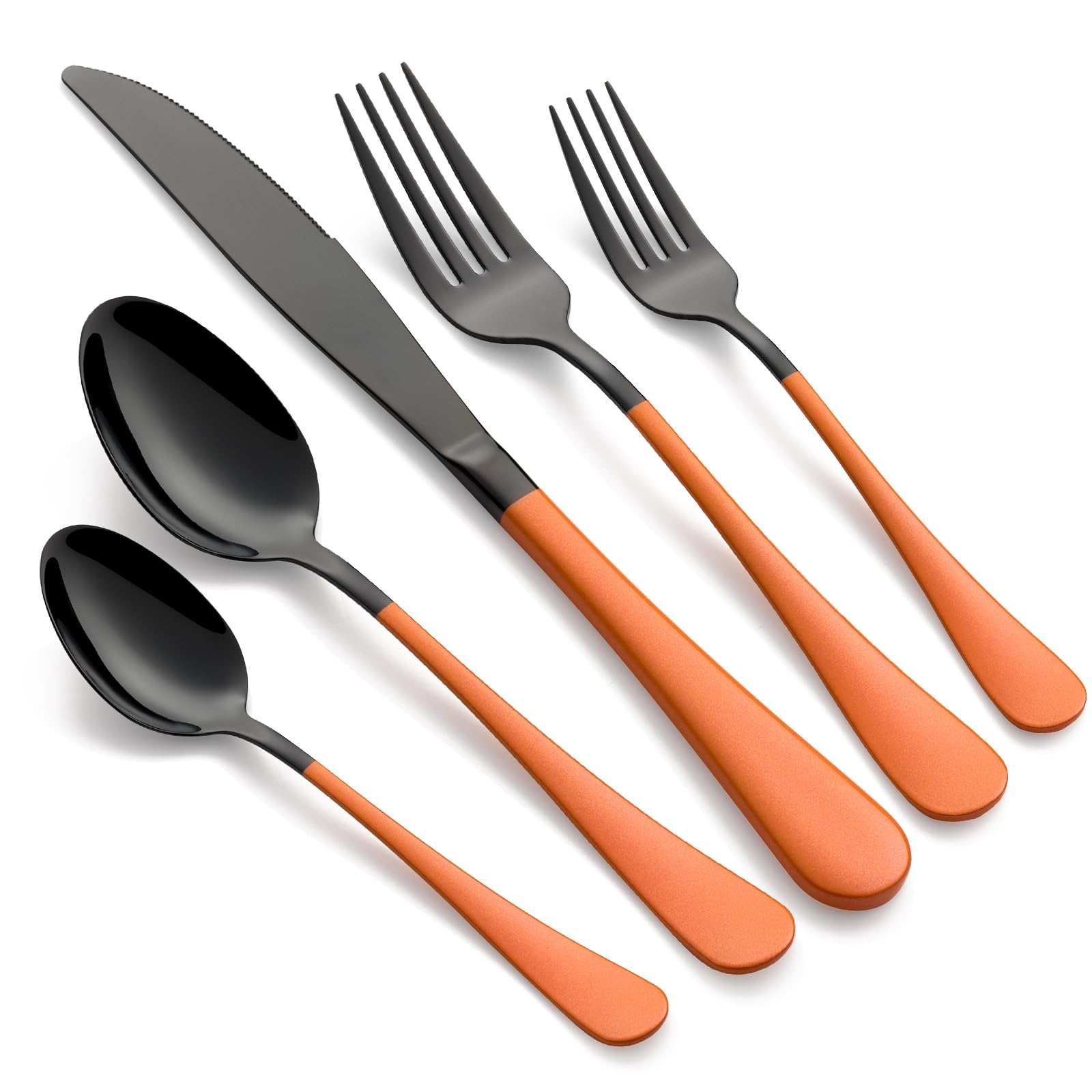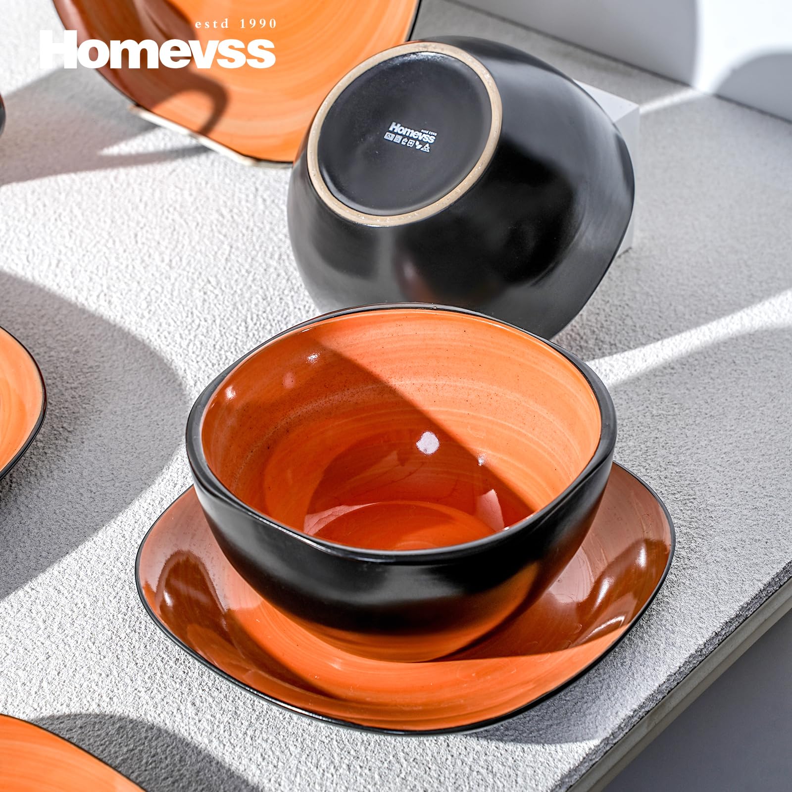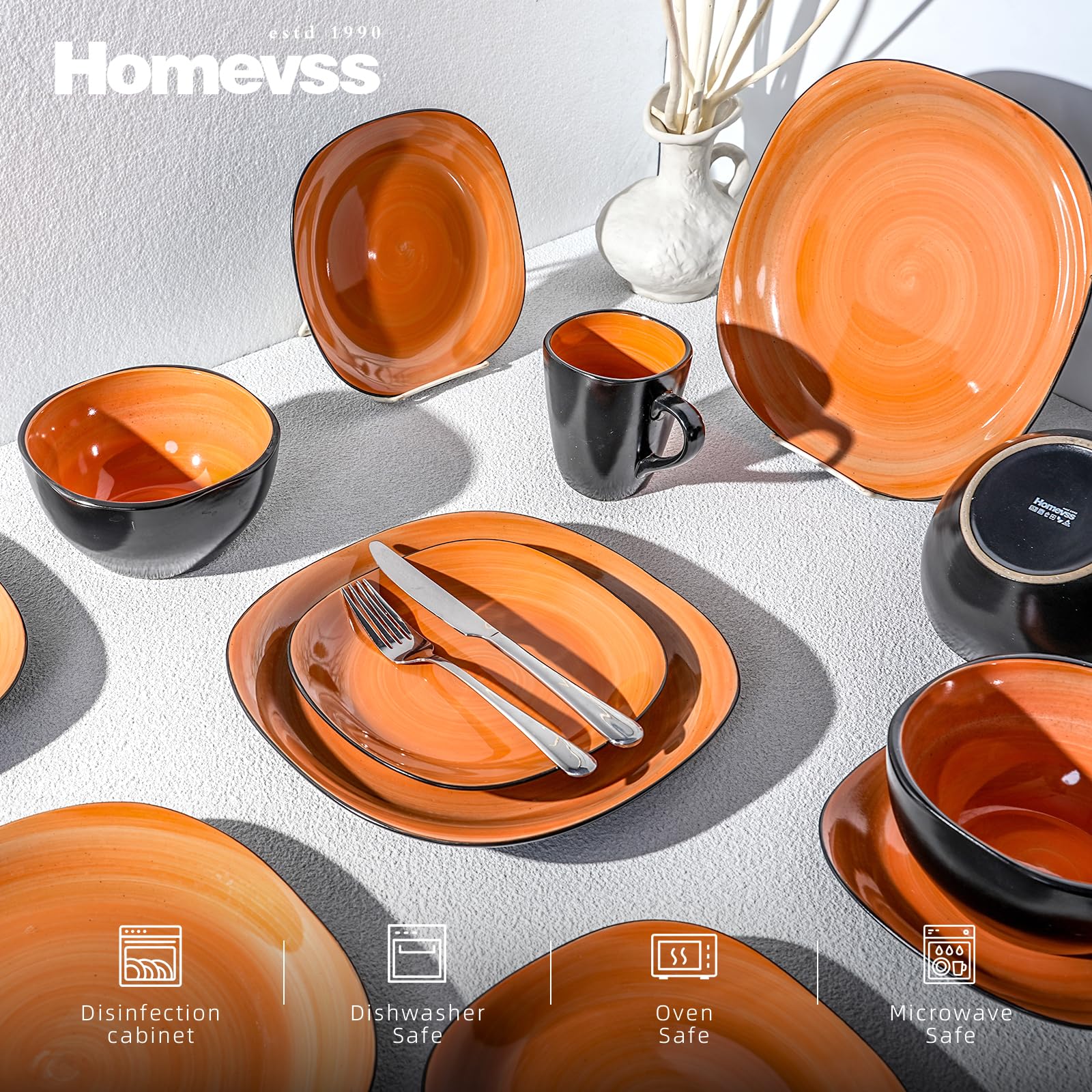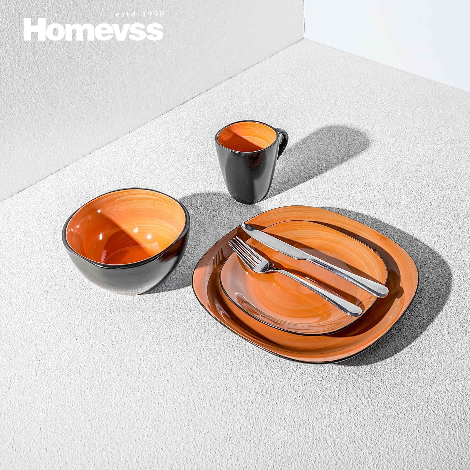 Square Shape 16pc Dinnerware Set with Spinwash Swirl Orange Inside and Matte Black Outside, make your table colorful, modern, natural and attractive